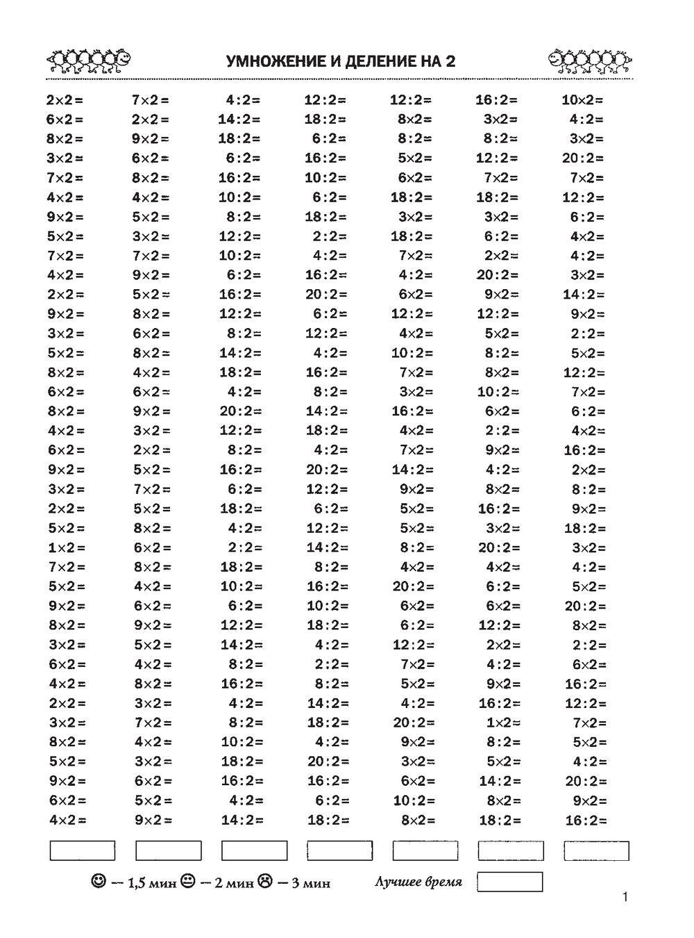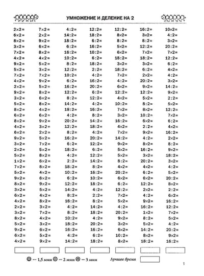 There are 7 columns of 38 examples on each page. At the end of the column, the time is written down. In the bottom left corner there are benchmarks: the ideal time for solving one column, a satisfactory time and a result that should make the student think. To achieve good results, one page should be solved each day.