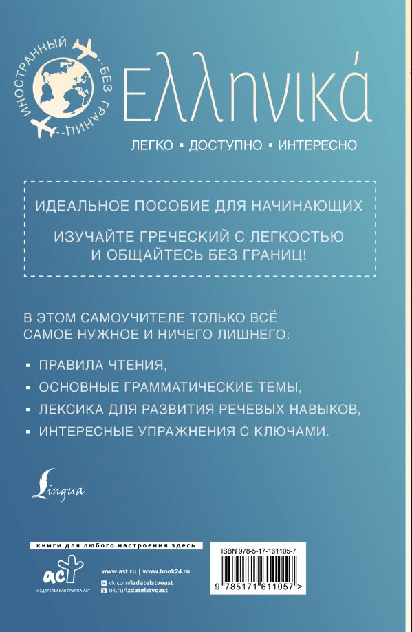 In this self-study book you will find everything you need to master the beginning level of Greek: the basics of grammar, basic vocabulary, conversational phrases, reading and pronunciation rules. Grammatical topics alternate with lexical topics to help you develop your speaking skills. You will learn how to talk about yourself and people you know, how to consult a doctor, and how to discuss your favorite book or movie. Each of the 35 lessons has exercises for successful consolidation of the topic, the answers to which are located at the end of the book. Small country-specific inserts will help you learn more about the culture of Greece. The material in the manual is presented in the most clear and accessible way and is accompanied by a large number of tables.