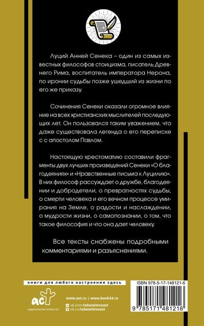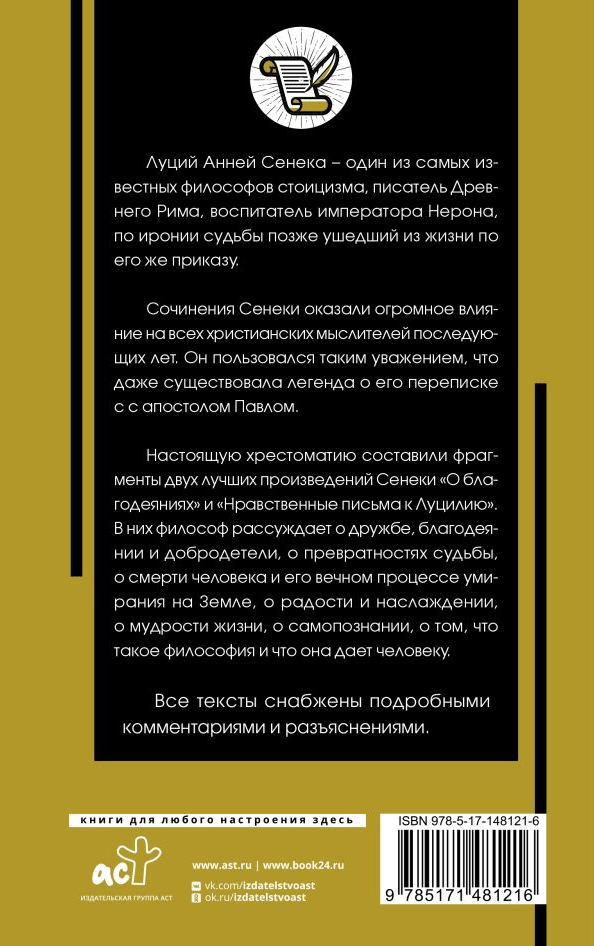Seneca's writings had a tremendous influence on all Christian thinkers of later years. He was so respected that he was even credited with corresponding with the Apostle Paul. This textbook contains fragments of two of Seneca's best works, "On Beneficence" and "Moral Letters to Lucilius". In them, the philosopher discusses friendship, beneficence and virtue, the vicissitudes of fate, the death of man and his eternal dying process on Earth, joy and pleasure, the wisdom of life, self-knowledge, what philosophy is and what it gives to man.