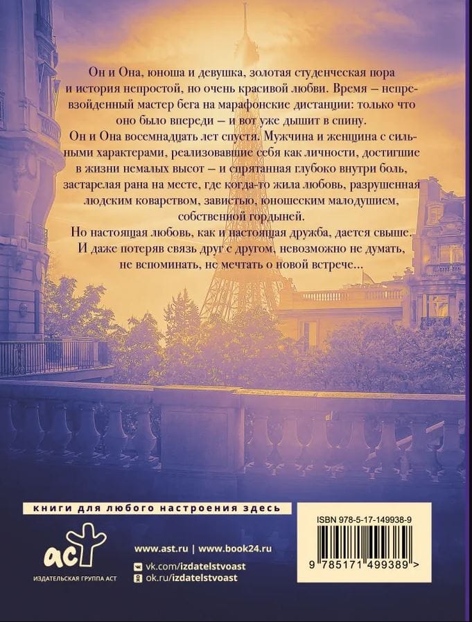 He and She, a young man and a young woman, the golden age of students and the story of a complicated but very beautiful love. Time is an unrivaled master of running marathon distances: just when it was ahead, it is already breathing down its back. He and She eighteen years later. A man and a woman with strong characters, who have realized themselves as individuals, who have reached great heights in life - and hidden deep inside the pain, a lingering wound in the place where love once lived, destroyed by human guile, envy, youthful cowardice, their own pride. But true love, like true friendship, is given from above. And even after losing contact with each other, it is impossible not to think, not to remember, not to dream of a new meeting....