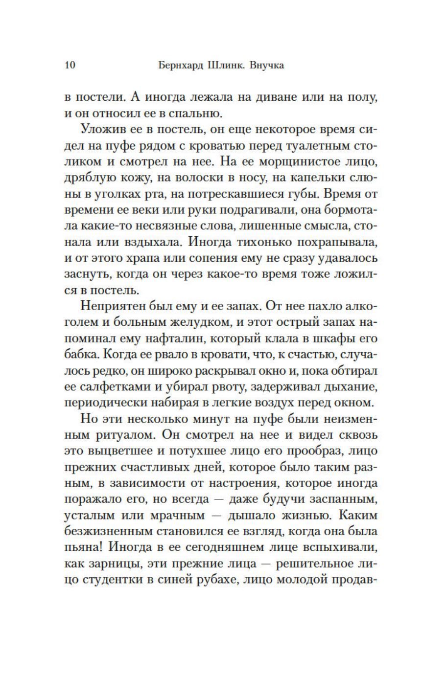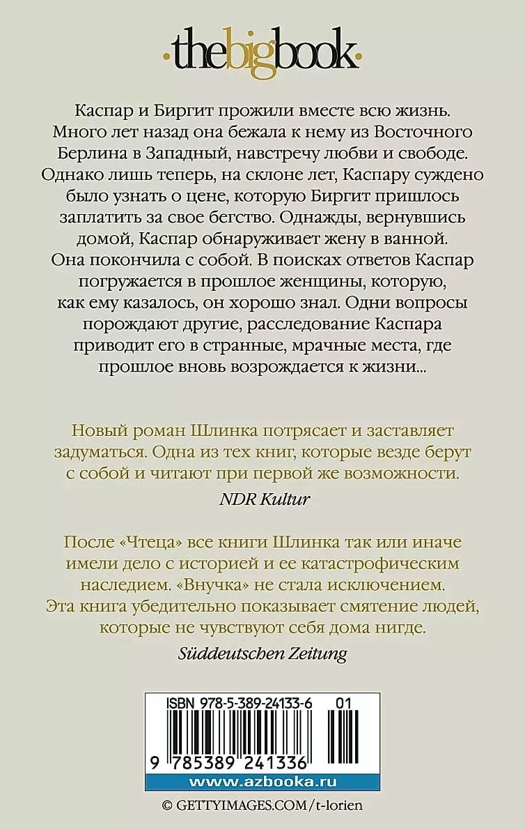 "Granddaughter" - the latest novel by Bernhard Schlink, the author of the acclaimed "Reader", a poignant story about the clash of generations, about the impossibility of forgetting their past, about the paradoxes of love and time. Kaspar and Birgit have lived together all their lives. Many years ago she fled to him from East Berlin to West Berlin, towards love and freedom. Only now, however, in his declining years, was Kaspar to learn the price Birgit had to pay for her escape. One day, returning home, Kaspar finds his wife in the bathtub. She has committed suicide. Searching for answers, Kaspar delves into the past of a woman he thought he knew well. One question begets another, Kaspar's investigation leads him to strange, dark places where the past is brought back to life....