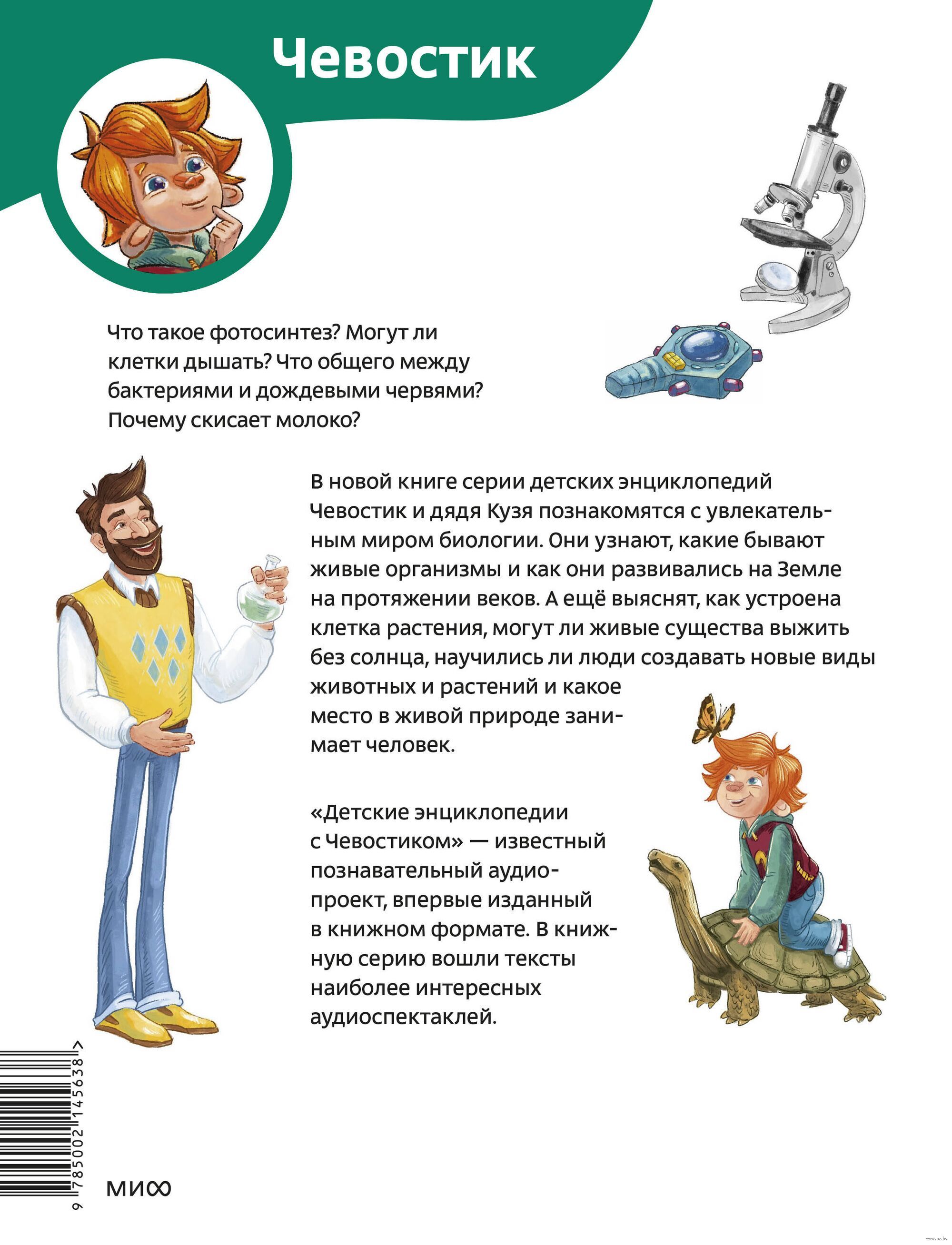 In the new book of the series of children's encyclopedias Chevostok and Uncle Kuzya will get acquainted with the fascinating world of biology. They will learn what are living organisms and how they have evolved on Earth over the centuries. They will also find out how a plant cell is organized, whether living things can survive without the sun, whether people have learned to create new species of animals and plants and what place in nature is occupied by man.