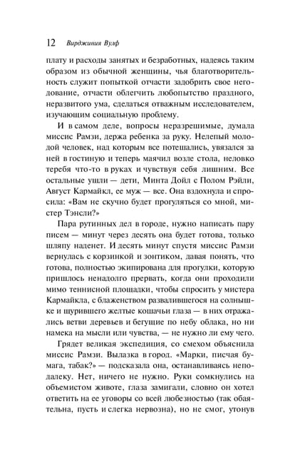 "To the Lighthouse" is a categorically unusual book. Two days separated by a ten-year span of time. Depicted ideas, moods and spiritual experiences. A memory by which a larger life gradually and imperceptibly enters this subtle and elegant novel. Such is Virginia Woolf's most famous work.