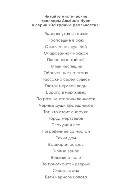 Sharp stories by Albina Nuri - mystical stories that draw you into their atmosphere and tickle the nerves at the level of the best examples of the genre. They will appeal to everyone who wants to learn more about the dark forces and make a virtual journey into the world of frightening and unknown.