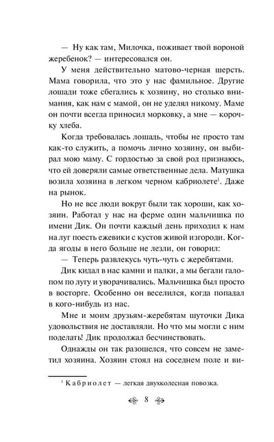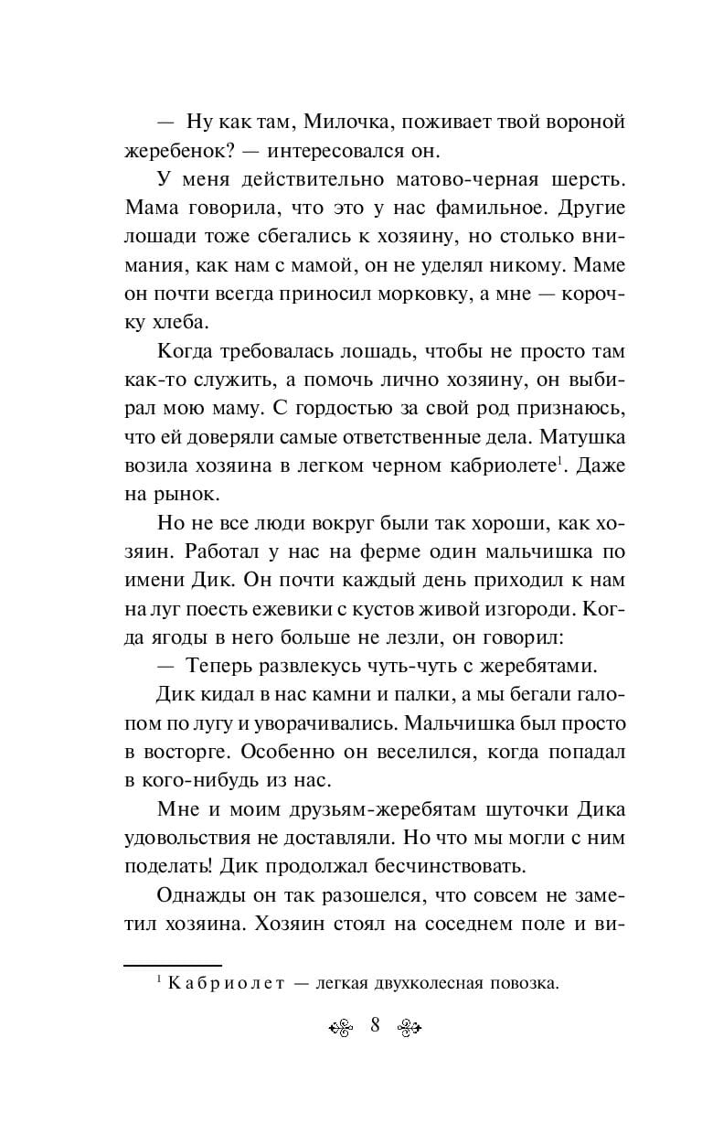 The touching story of a noble raven horse named Black Handsome, faithfully and faithfully serving people, told by himself. On the pages of the book the main character lives a long equine life, full of unpredictable turns and dramatic events. Having passed the way from an unintelligent foal to a wise aging animal, Black Handsome learned to distinguish between good and evil, to be loyal and patient, to appreciate attention and sympathy.