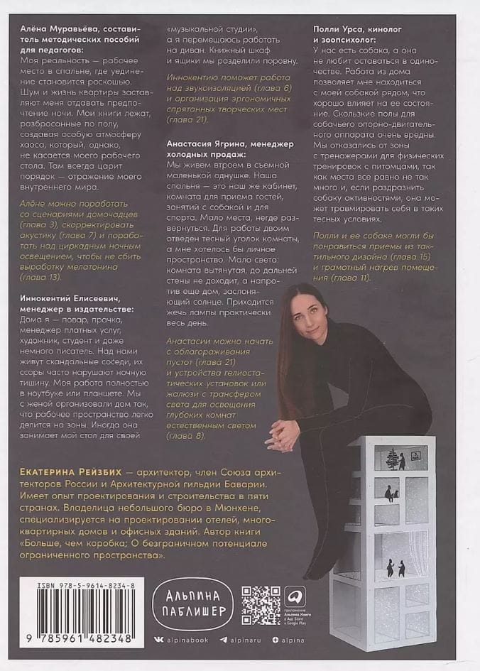 Tips and advice from architect and conceptualist Ekaterina Reisbich will help you adapt your apartment for any needs - from creating a creative studio to a cozy corner for work. From the book you will learn about the author's methodology of space design based on the study of human behavior and will be able to make your apartment a comfortable place to achieve your life goals.
