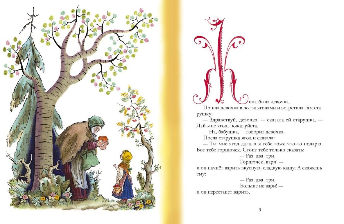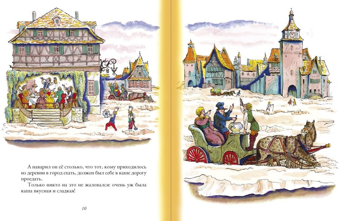The simple plot of this short humorous tale is easily understood by very young children who are just beginning their acquaintance with the book, and Vladimir Konashevich's illustrations are so lively and "cozy" that even adult readers have the desire to immediately settle on its pages and eat their way through the sweet porridge in company with the inhabitants of the ancient town.