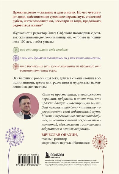 “This is not just a book, but an opportunity to adopt the wisdom and experience of those who have lived a long and fulfilling life. It will help each reader rethink their own path. The thoughts and experiences of centenarian grandmothers, described with such sincerity and warmth, inspire and make you think about eternal questions." — Vyacheslav Opakhin, editor-in-chief of the sports portal "Championship"