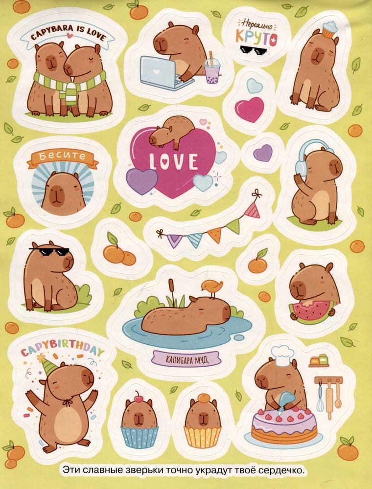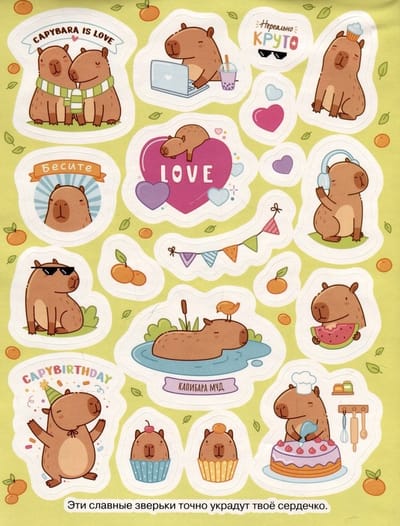 Your attention is invited to the stickers with cute and cheerful capybaras.