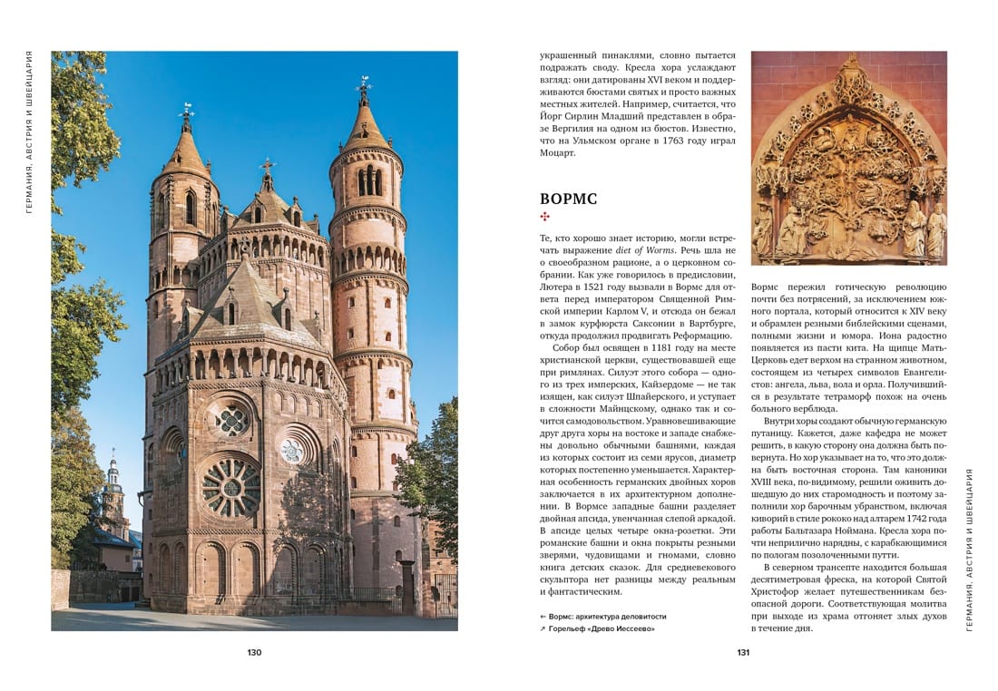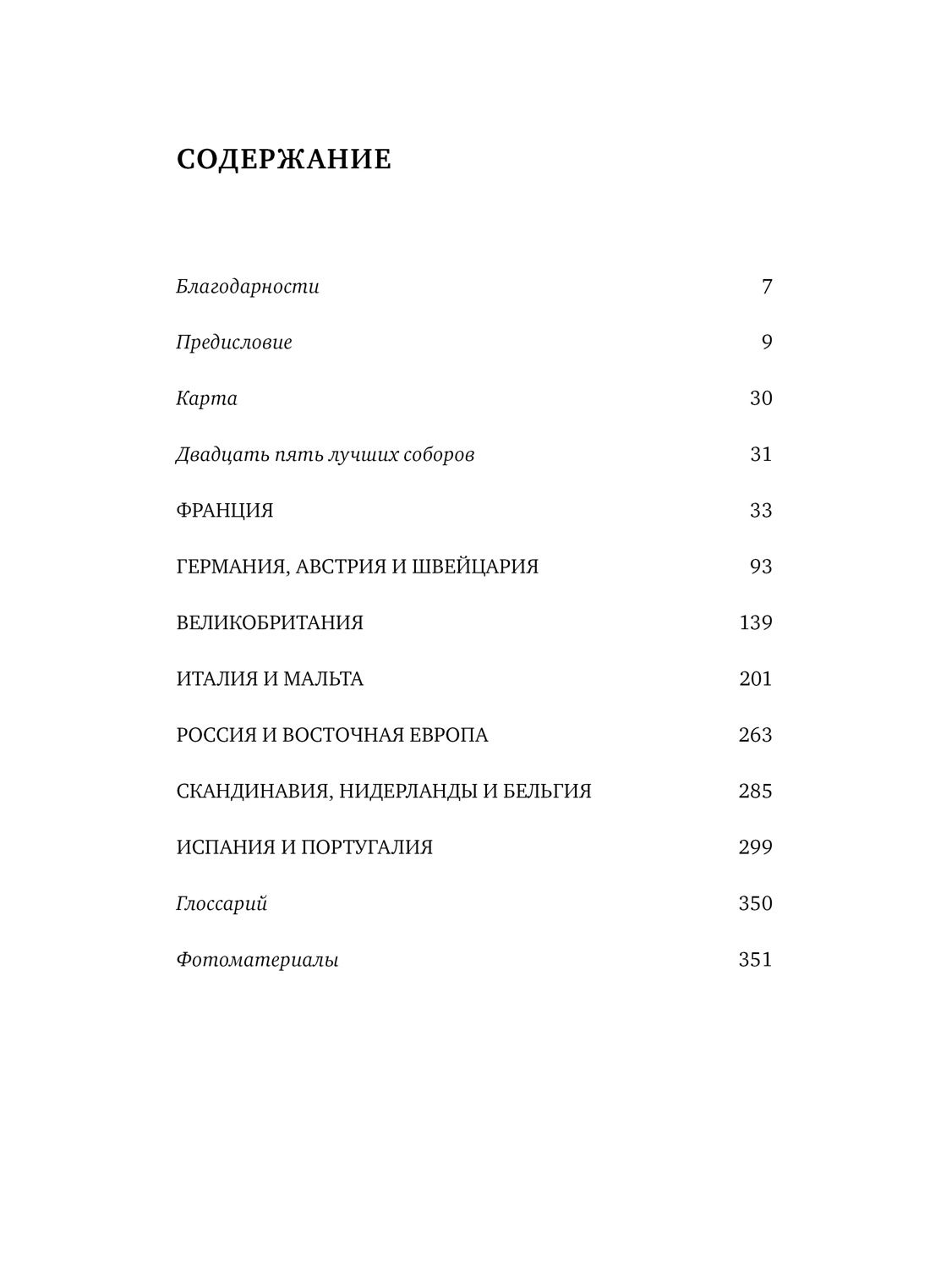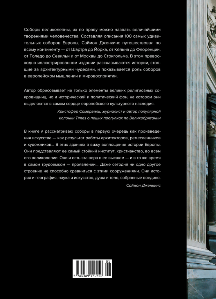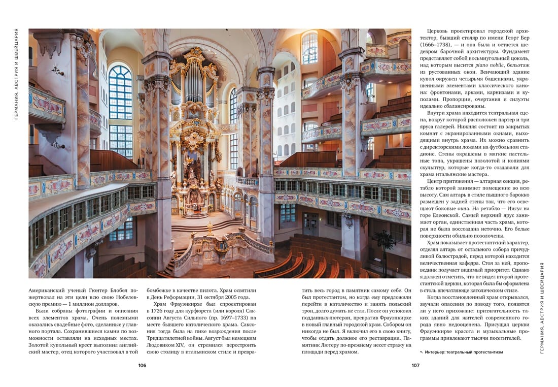 Essays on 100 cathedrals in Europe, divided by region: France, Germany, Austria and Switzerland, Great Britain, Italy and Malta, Russia and Eastern Europe, the Scandinavian countries and the Netherlands, Spain and Portugal. Renowned British author Simon Jenkins discusses the significance of a particular cathedral, the history of construction and rebuilding, important details of the interior and facade, and elements of decoration, providing insight into the historical context and biographies of the architects. The preface provides a brief but comprehensive characterization of Romanesque, Gothic and New Age architecture. The book is superbly illustrated and includes a map of Europe with the cathedrals in question.