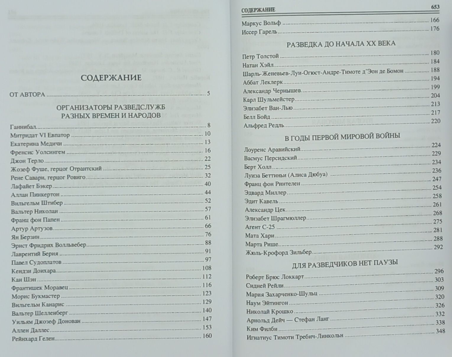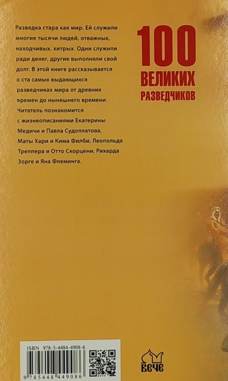 Intelligence is as old as time. It has been served by many thousands of people, brave, resourceful, cunning. Some served for money, others did their duty. This book tells about a hundred of the most outstanding scouts of the world from ancient times to the present time. The reader will get acquainted with the biographies of Catherine de Medici and Pavel Sudoplatov, Mata Hari and Kim Philby, Leopold Trepper and Otto Skorzeny, Richard Sorge and Ian Fleming.