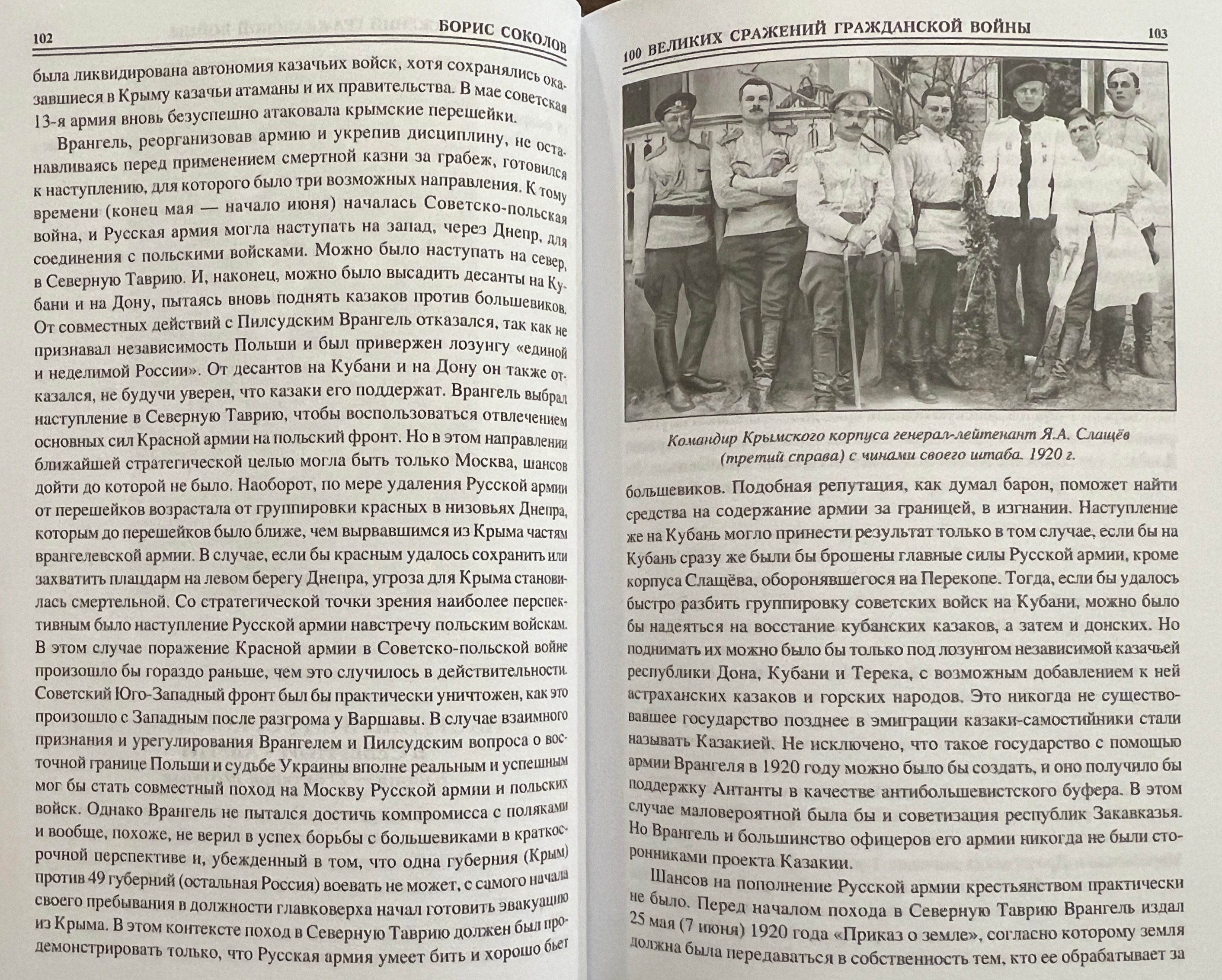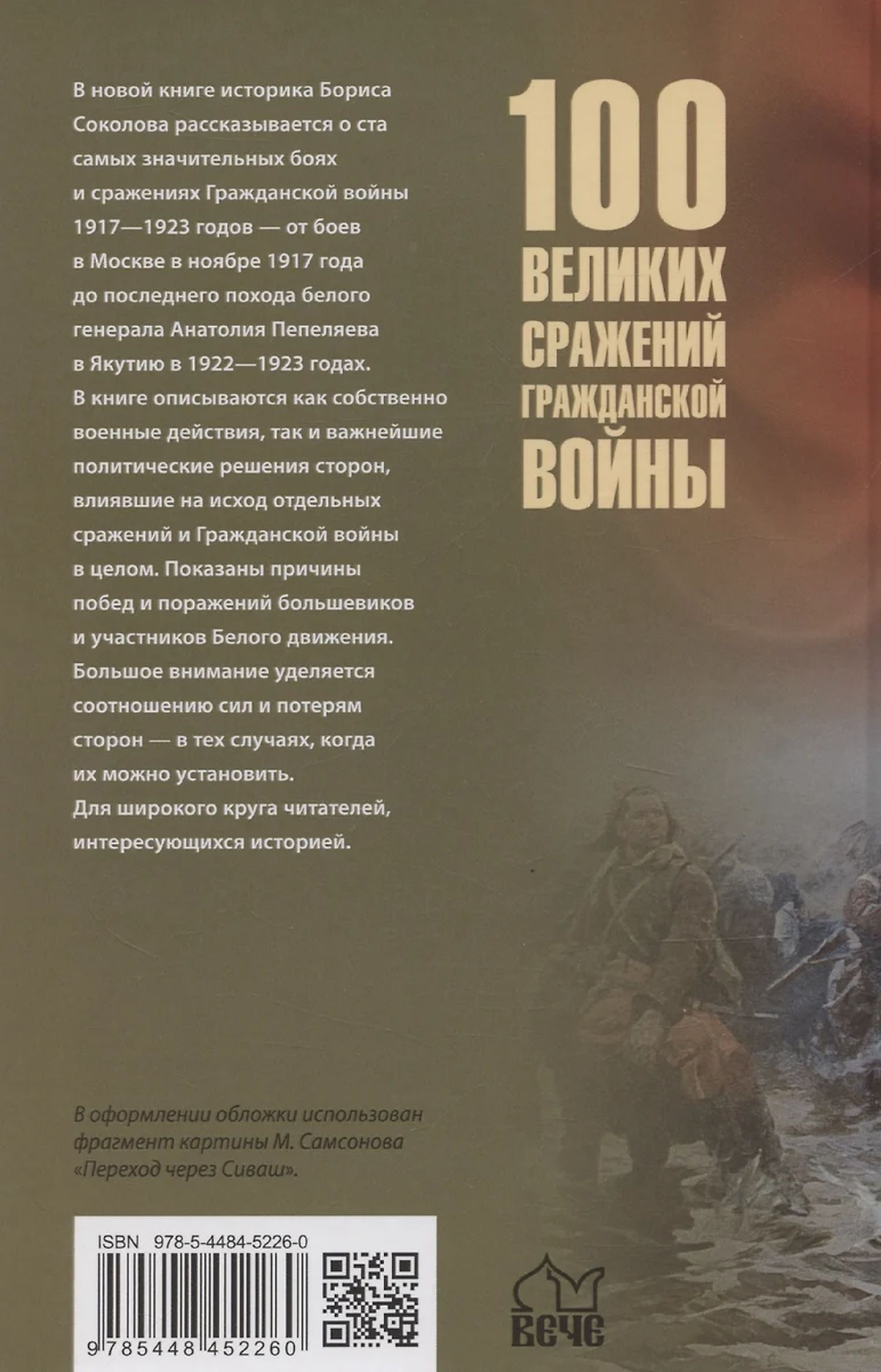 The new book by historian Boris Sokolov tells about the hundred most significant battles and fights of the Civil War of 1917-1923 — from the battles in Moscow in November 1917 to the last campaign of the White General Anatoly Pepeliaev in Yakutia in 1922-1923. The book describes both the military actions themselves and the most important political decisions of the parties that influenced the outcome of individual battles and the Civil War as a whole. The reasons for the victories and defeats of the Bolsheviks and the White movement are shown. Much attention is paid to the balance of forces and losses of the parties — in cases where they can be established. For a wide range of readers interested in history.