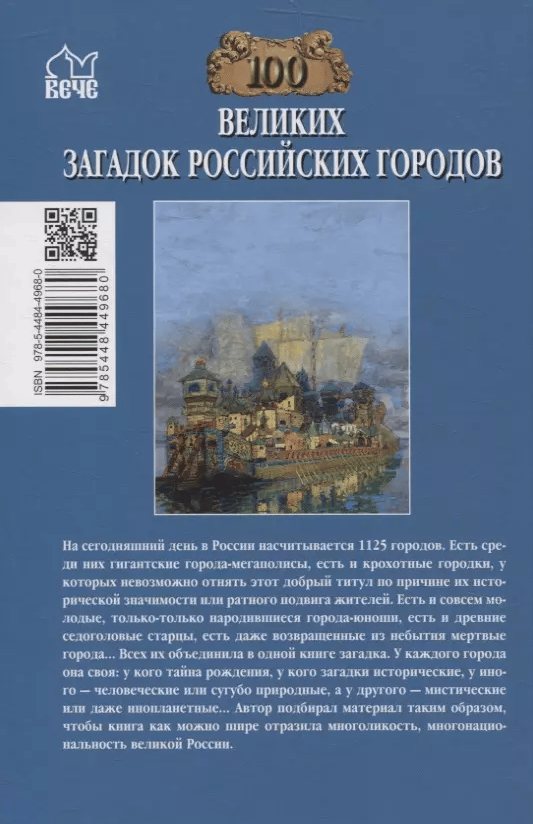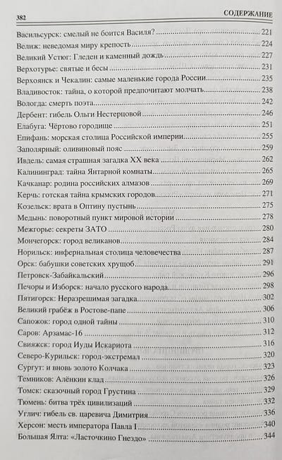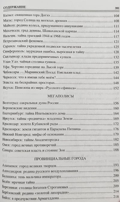 There are 1,125 cities in Russia today. There are giant megacities among them, there are tiny towns, which cannot be taken away from this good title because of their historical significance or military feat of the inhabitants. There are very young, just born young cities, there are ancient gray-headed elders, there are even dead cities returned from oblivion. They all came together in one book. Each city has its own: who has the secret of birth, who has historical mysteries, someone has human or purely natural ones, and another has mystical or even alien ones. The author selected the material in such a way that the book reflected as widely as possible the multifaceted, multiethnic nature of great Russia.