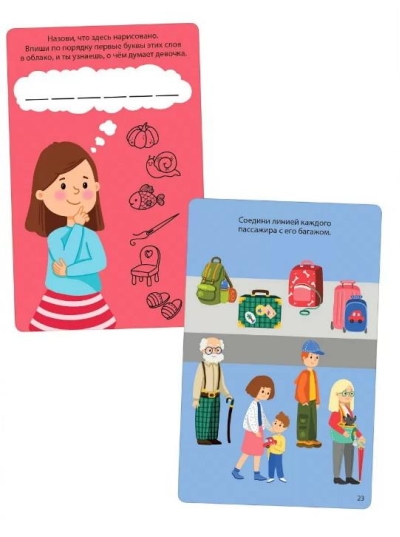The set includes 50 double-sided, reusable cards with tasks of different levels of difficulty and types: "doodle", "find differences", "find extra", mazes, crosswords, Sudoku, puzzles, counting problems and many others.
