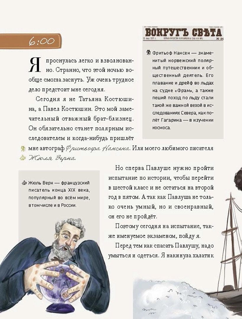 Moscow, 1897. Pavel Kostyushin has an important history exam, but here's the problem - he had a quarrel with his teacher at the beginning of the school year and has not opened the textbook since then. But his twin sister knows history very well and is ready to go to the gymnasium instead of her brother. Will the twins manage to pull off a risky adventure? The answer is in the diary of Tanya Kostyushina, who describes in detail the day of the exam, and at the same time tells about the everyday life of those times. Where did Muscovites get their water from? Where was food stored? How were exams in gymnasiums? Learn more about 19th century Moscow!