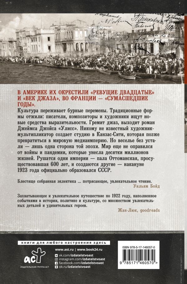 The events of 1922 reverberated throughout the twentieth century, and continue to affect us a hundred years later. Empires fell. The Soviet Union was officially established, and Mussolini's Italy became the first fascist state. T. S. Eliot's "Barren Land" was published in full for the first time. S. Eliot and James Joyce's "Ulysses." Prohibition was at its peak in the United States, and shaken by a string of scandals, the Hollywood movie industry continued to grow. A new medium, radio, was emerging, and in Britain the BBC was founded. In a postwar society already altered by bloody trauma and pandemic, the mores of the past seemed even more obsolete; the "roaring twenties" began to rumble on, heralding the beginning of the "jazz age."