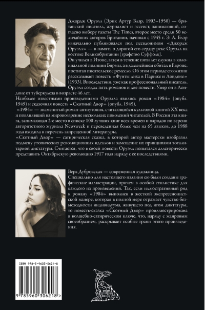 1984 is a celebrated dystopian novel, considered a cult classic of the 20th century and influential in the worldview of several generations of readers. In Russia, this book ranks second on Newsweek's list of the 100 best books of all time and has been translated into more than 65 languages. "Animal Farm" is a satirical tale in which the author masterfully depicts the substitution of utopian revolutionary ideals for the principles of totalitarian dictatorship. A new translation was specially completed for this edition by Rostislav Grishchenkov. Illustrations by Vera Dubrovskaya.