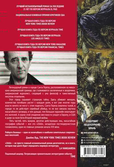 A major novel from the most prominent voice of Latin American literature of his generation, best book of the year by Time Magazine, New York Magazine, and the Financial Times, winner of the U.S. National Book Critics Circle Award. A legendary novel about the fictional town of Santa Teresa on the Mexican-American border, where prisoners and academics, an American journalist, a maddening philosopher, and a mysterious hermit writer collide. But this town hides a terrible secret. Women are being murdered here, and the death toll is rising every day. The authorities can do nothing, Santa Teresa is engulfed in darkness, and the further away, the more paranoid the atmosphere becomes. And the roots of this epidemic of brutality go back to Europe, to America and even to the battlefields of World War II. Five parts, five genres, dozens of protagonists, large-scale geography of events - all this is "2666", an enigmatic postmodern puzzle, one of the major novels of the early twenty-first century.