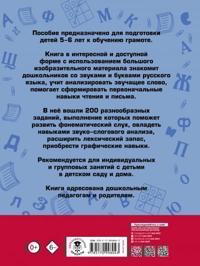 The book includes 200 diverse tasks that will help develop phonemic awareness, master sound-syllabic analysis skills, expand vocabulary, and acquire graphic skills.