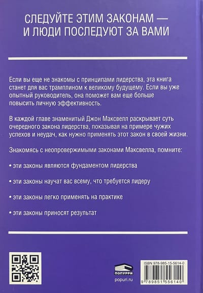 In each chapter, the famous John Maxwell reveals the essence of the next law of leadership, showing how to apply this law in your life using the example of other people's successes and failures.