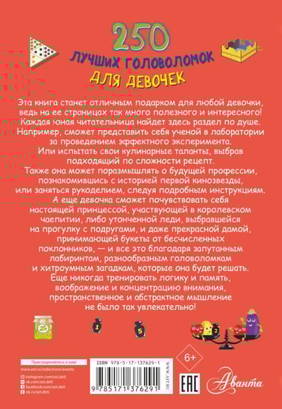 This book - a real boon for girls, because it has so much interesting: simple but effective experiments, culinary secrets, entertaining facts about fashion, theater and cinema, detailed instructions and flyhacks for different occasions, and most importantly - a lot of clever puzzles and tasks, fascinating riddles, intricate mazes and other entertaining tasks. Leafing through the pages of the book, you will learn a lot of new things, increase your intelligence, can develop logical thinking, attentiveness and diligence. And at the same time, believe me, it will not be boring! For middle school age.