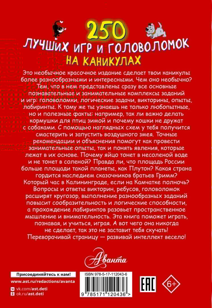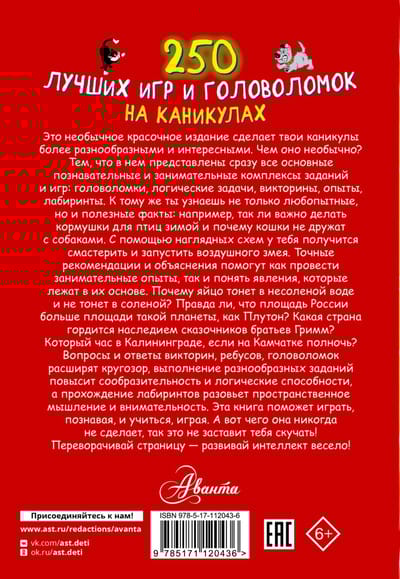 Don't know what to do on vacation? Open this book and the question will disappear by itself. On the pages of this colorful edition are presented a variety of complexes of knowledge - cognitive and developmental: puzzles, logical problems, quizzes, entertaining experiments, mazes. Fulfillment of various tasks will increase erudition, intelligence, logical abilities, passing mazes will help develop spatial thinking and attentiveness, curious facts will broaden your horizons, clear schemes will teach how to fold origami, accurate recommendations will give the opportunity to test the effect of physical laws, and accessible explanations - to understand the causes of certain phenomena. Why cats are not friends with dogs and is it true that bees recognize their master? What always increases but never decreases and what word ends with three letters "e"? What dish should you try when in Spain and what is the most popular sport in Canada? Questions and answers of quizzes, tasks, puzzles, rebuses represent a whole system of knowledge that you will have if you spend your free time in a useful way.