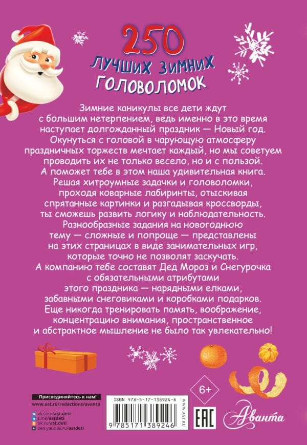 The book "250 Best Winter Puzzles" differs from other editions of this series, because it is prepared for the New Year, and this is the most favorite holiday for children of any age. They are waiting for it very much, preparing for it, making gifts to their loved ones and, of course, receiving them themselves. On these pages the children are offered a variety of exciting tasks: to look for lost objects in unusual pictures, to find the way out of confusing mazes, to show the differences between seemingly identical pictures, to solve puzzles and math problems. And all this is presented in the form of funny winter games in the company of the main character of the New Year - Santa Claus. We are sure: the book will not only help children to develop logic, attention, memory and thinking, but also create a festive mood. Spend your winter vacation in a fun and useful way!