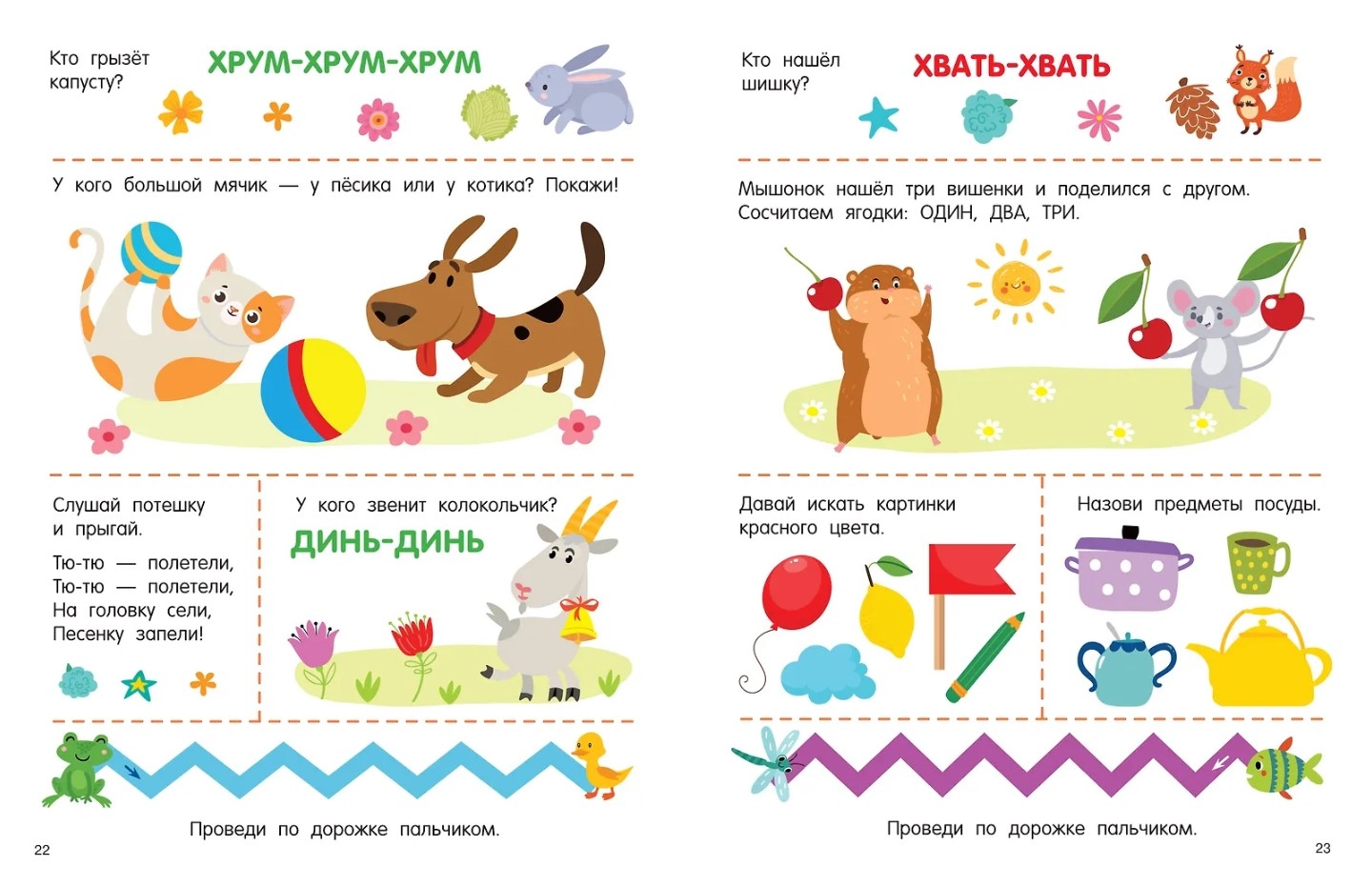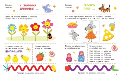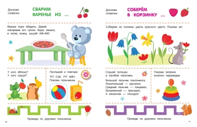 A beautifully illustrated book for little ones with 30 stickers of various sizes. Fun picture games, songs, nursery rhymes, first coloring pages, stepping games, chatterbox rhymes, finger exercises—everything you need to develop speech, thinking, emotional intelligence, visual perception, and fine motor skills. The colorful pages feature engaging storylines to keep your child engaged. A bonus: large, well-printed stickers that peel off easily, perfect for little fingers.
