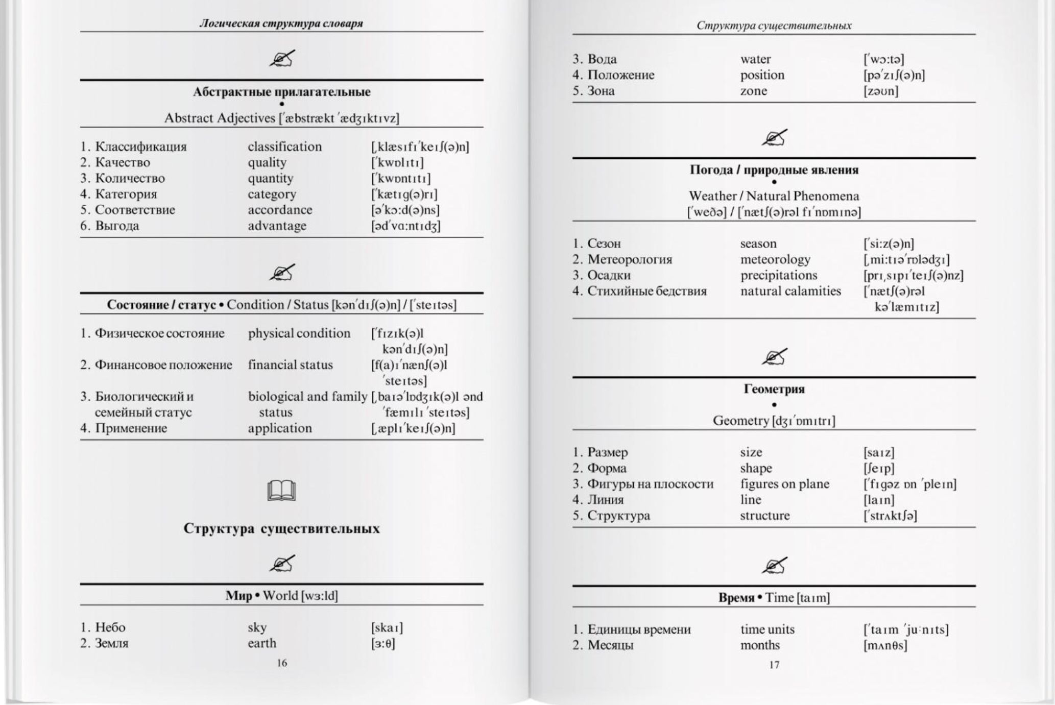 This manual is a basic vocabulary containing over 3,000 words essential for communicating in English. The dictionary was created using an original method for accelerated memorization of English words. The method is based on logical coding—dividing words within parts of speech into groups united by a common concept or association, and assigning them code names. This allows for easy recall of the needed word by quickly "running" through the entire vocabulary. This basic vocabulary is designed for a wide range of individuals studying English independently and seeking to deepen and systematize their knowledge.