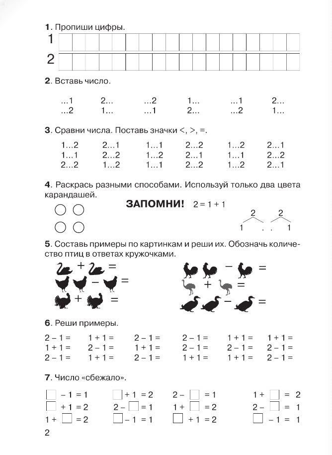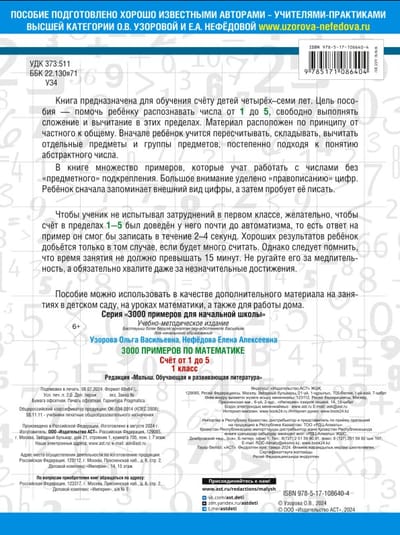 The book is designed to teach counting to children aged four to seven. The purpose of the book is to help the child recognize numbers from 1 to 5 and to perform addition and subtraction within these limits. At first, the child learns to count, add and subtract individual objects and groups of objects, gradually approaching the concept of an abstract number.