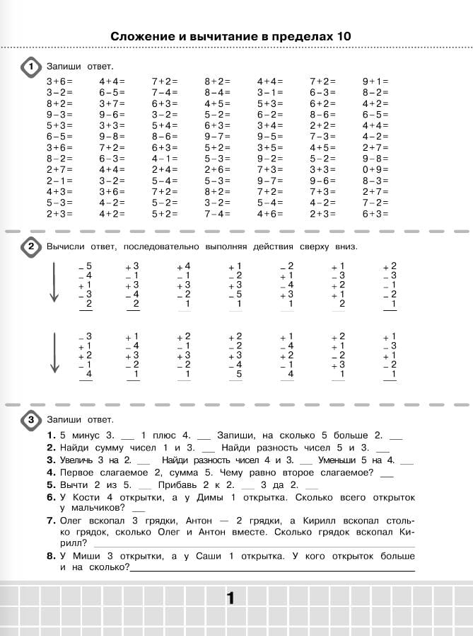 The variety of wording and types of tasks will not only allow you to practice counting until it becomes automatic, but also teach your child to look for and find rational ways to solve examples and problems.