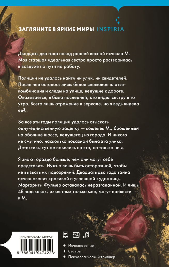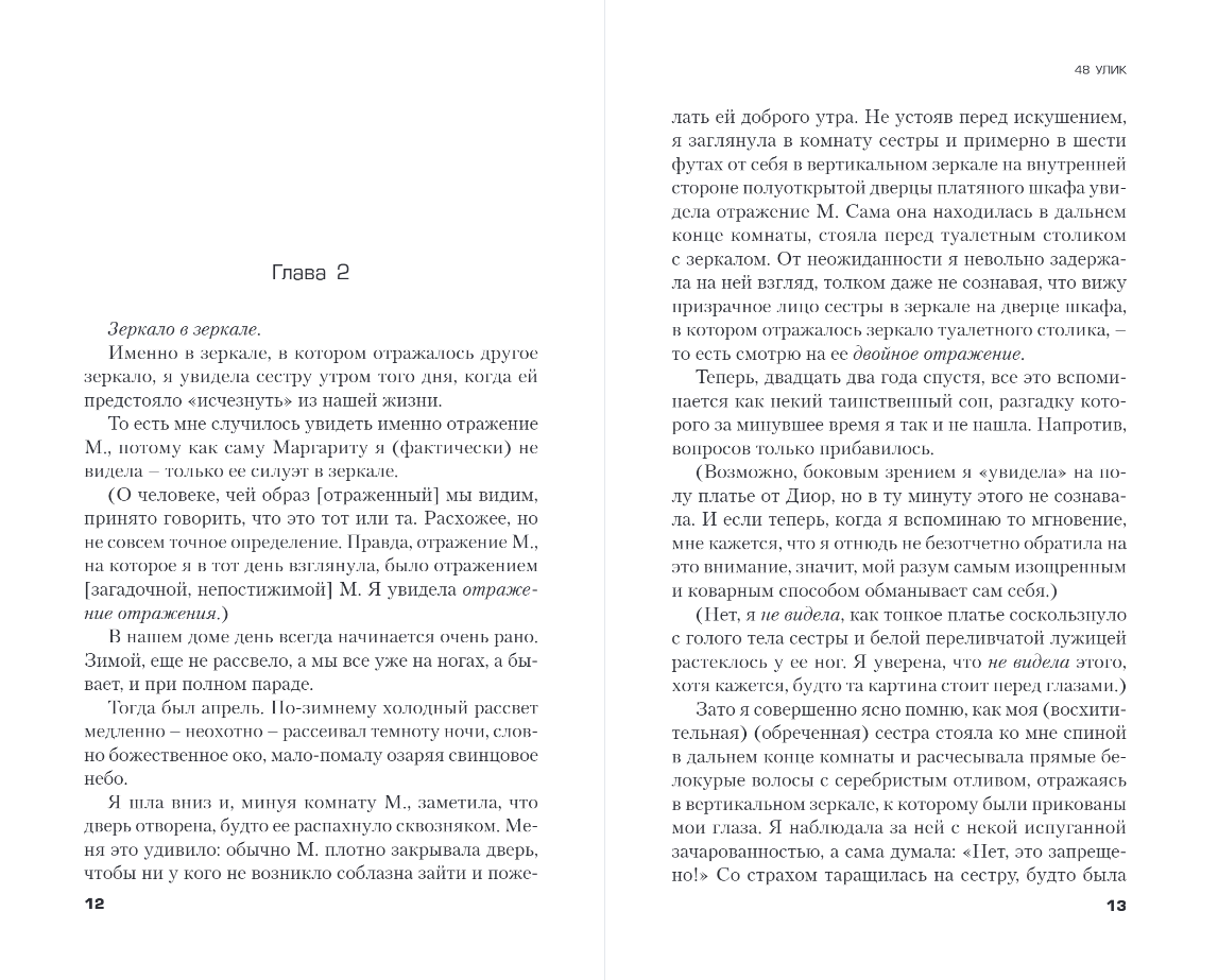 Twenty-two years ago, in the early spring, M disappeared. My older ideal sister simply disappeared into thin air on her way to work. Police were unable to find any evidence or witnesses. After her, only a white silk dress-combination and traces on the street leading to the road remained. Turns out I was the last person to see my sister that morning. It's just a reflection in the mirror, but I saw it, right? .
