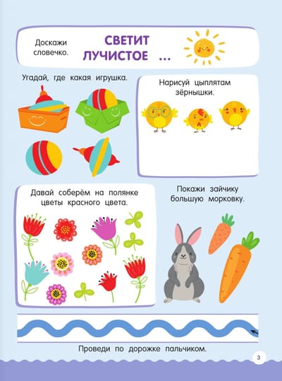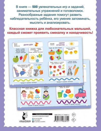 "500 fascinating tasks for kids 2-4 years" will help instill in the child an interest in studying the world around him and a love of gaining new knowledge, will be indispensable helpers for parents. A lot of exciting games with pictures, which train speech, attention, memory, fine motor skills, coordination of movements, spatial thinking, observation. In our book of intellectual games and tasks - not a single boring page!