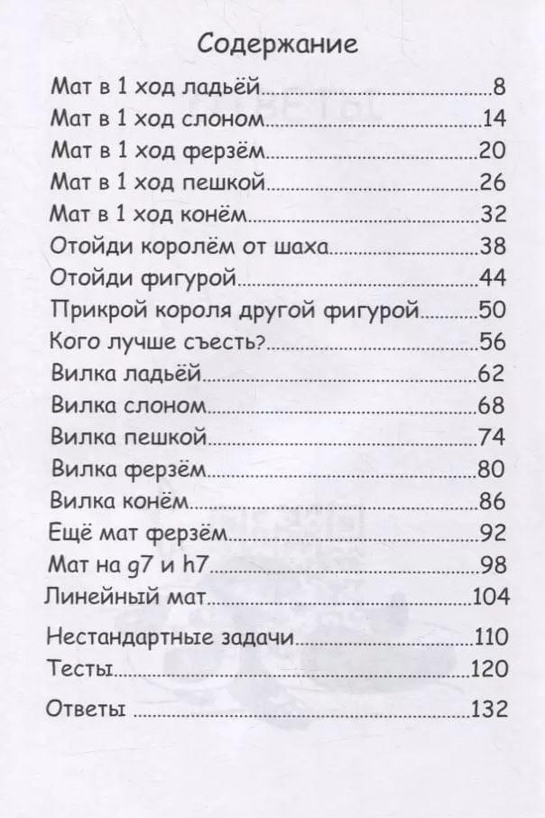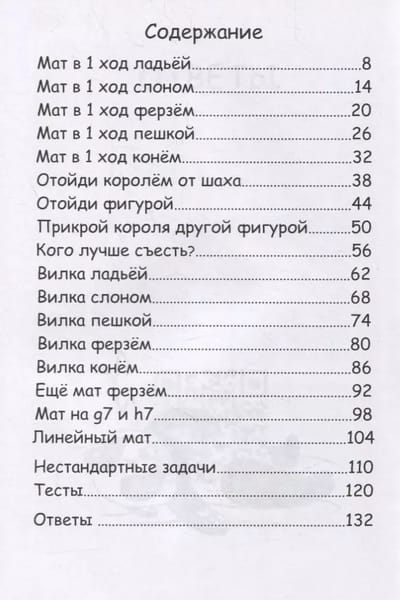 The book is designed for beginner chess players. It contains more than 500 simple tasks solved in one turn, in which you need, for example, to put a mate, make a fork or defend yourself.