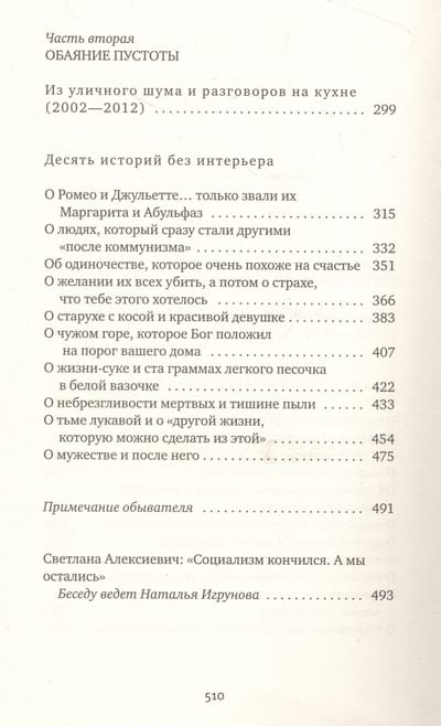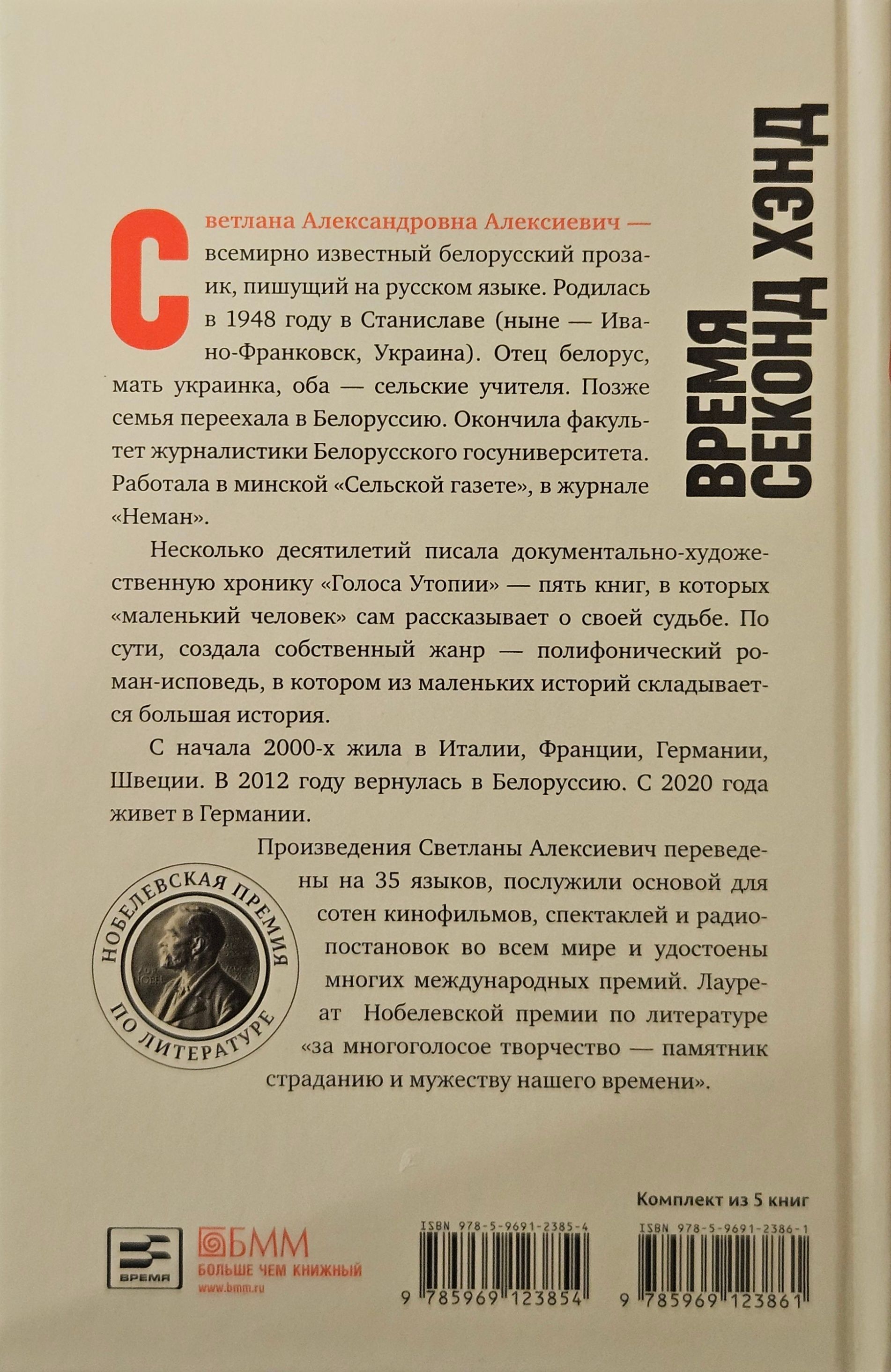 The final, fifth book of the famous fiction-documentary cycle "Voices of Utopia" by Svetlana Alexievich, winner of the Nobel Prize in Literature "for her multi-voiced work is a monument to the suffering and courage of our time". "Communism had a crazy plan," the author tells us, "to remake the 'old' man, the old Adam. And it succeeded.... Maybe the only thing that worked out. In seventy-odd years, the laboratory of Marxism-Leninism has developed a separate human type - homo soveticus. Some consider it a tragic character, others call it a "sovk." I think I know this man, he is well known to me, I am close to him, I have lived side by side for many years. He is me. These are my acquaintances, friends, parents". The monologues included in the book were recorded for ten years while traveling throughout the former Soviet Union.