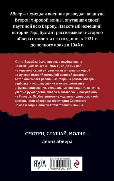 The author describes various aspects of the Abwehr's work - espionage, recruitment and use of agents, logistics and functioning, special operations and, of course, the participation of the Abwehr leadership in conspiracies and assassination attempts on Hitler. Particular attention is paid to the sabotage activities of the Abwehr on the territory of the Soviet Union during the Great Patriotic War.