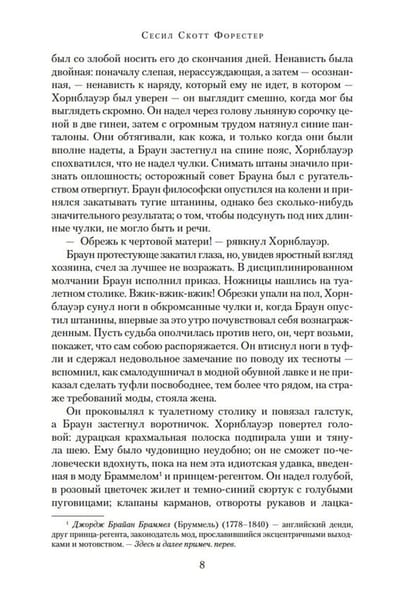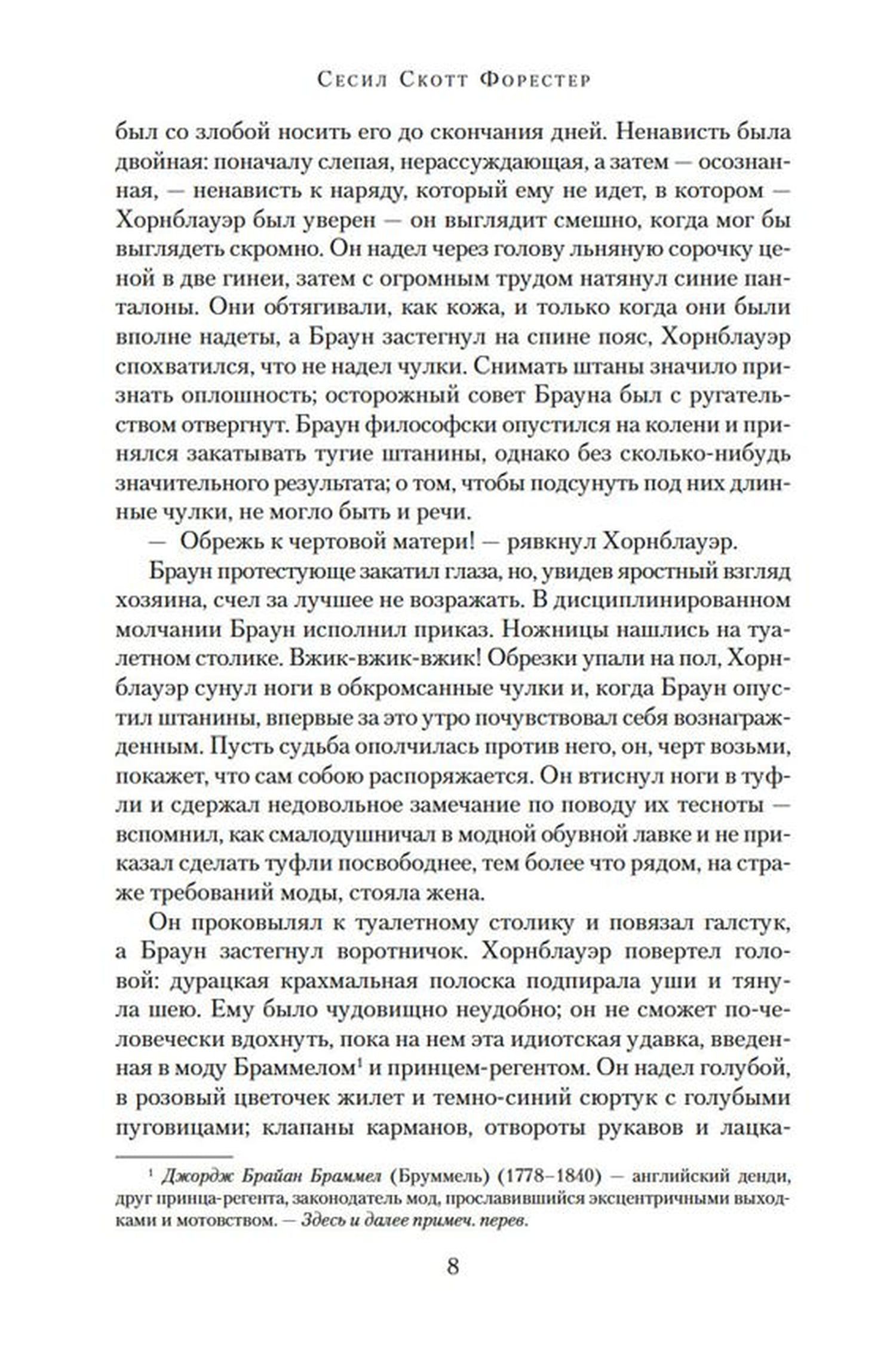 The saga of Horatio Hornblower, an officer of the British Royal Navy, who passed a glorious and difficult way from a simple midshipman to a lord and admiral, is a unique phenomenon in the world historical-adventure literature. Million circle of admirers, endless circulation, truly world recognition, which brought the writer to the classics of the genre, film and television versions with such famous actors as Gregory Peck, Christopher Lee, and other stars of world cinema. The author of the saga, Cecil Scott Forester, said of his hero, "He has delivered me countless friends all over the world. Customs officers read my last name and let my luggage through without inspection. He has set me up with admirals and princesses, and I am grateful to him, honestly, although I often think that it would be better if he had not." Not every writer is so lucky with a character. The Horatio Hornblower saga has left a notable literary mark. Bernard Cornwell's book series about the gunslinger Sharpe was influenced by Forester. Patrick O'Brien, drawing from the books of the famous saga, wrote a multi-volume epic about Captain Aubrey. Even Harry Harrison sparodied in a kindly way the image of the hero Forester in one of his stories ("Captain Gonario Harppleyer"). The book concludes the narrative of the naval exploits of Horatio Hornblower, a personality who, in the words of Winston Churchill, "evokes from the past the great and rugged image of the Royal Navy in the age of its glory".