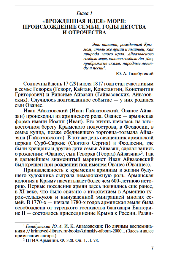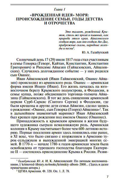 Ivan Konstantinovich Aivazovsky is a world-famous marinist, a representative of the "Golden Age" of Russian culture, one of the few artists of Russia who has achieved world fame. The author of about six thousand works, a participant in more than a hundred and twenty exhibitions, holder of many Russian and foreign orders, he found time for extensive public, educational, charitable activities. Traveling in Western Europe, trips to Turkey and the Caucasus were important milestones in his creative path, but still he drew inspiration primarily in his native Feodosia. Creative plans, inspiration, mental rest and aspiration for new achievements gave him the Black Sea, to which he dedicated his talent. The two elements - sea and painting - were perceived by him as inseparable, as a constant source of creativity, accompanied his life path, his disappointments and successes, storms and doldrums, accompanying the aspiration of a true artist - to serve Art and the Fatherland.
