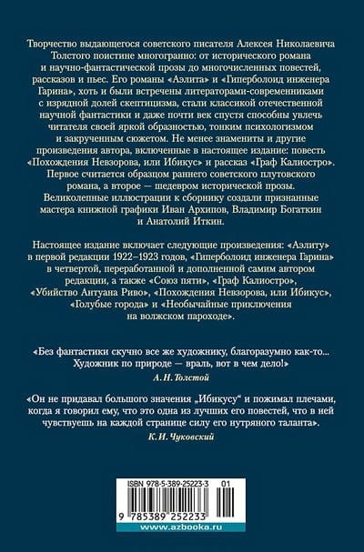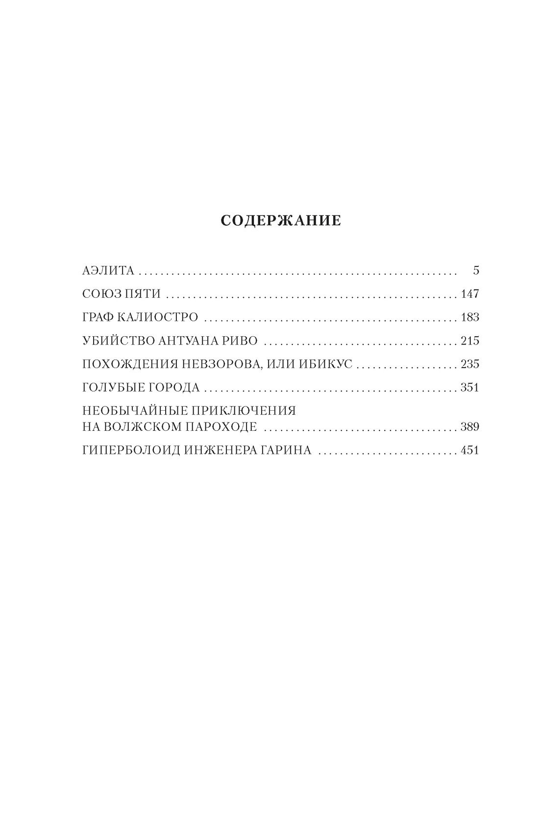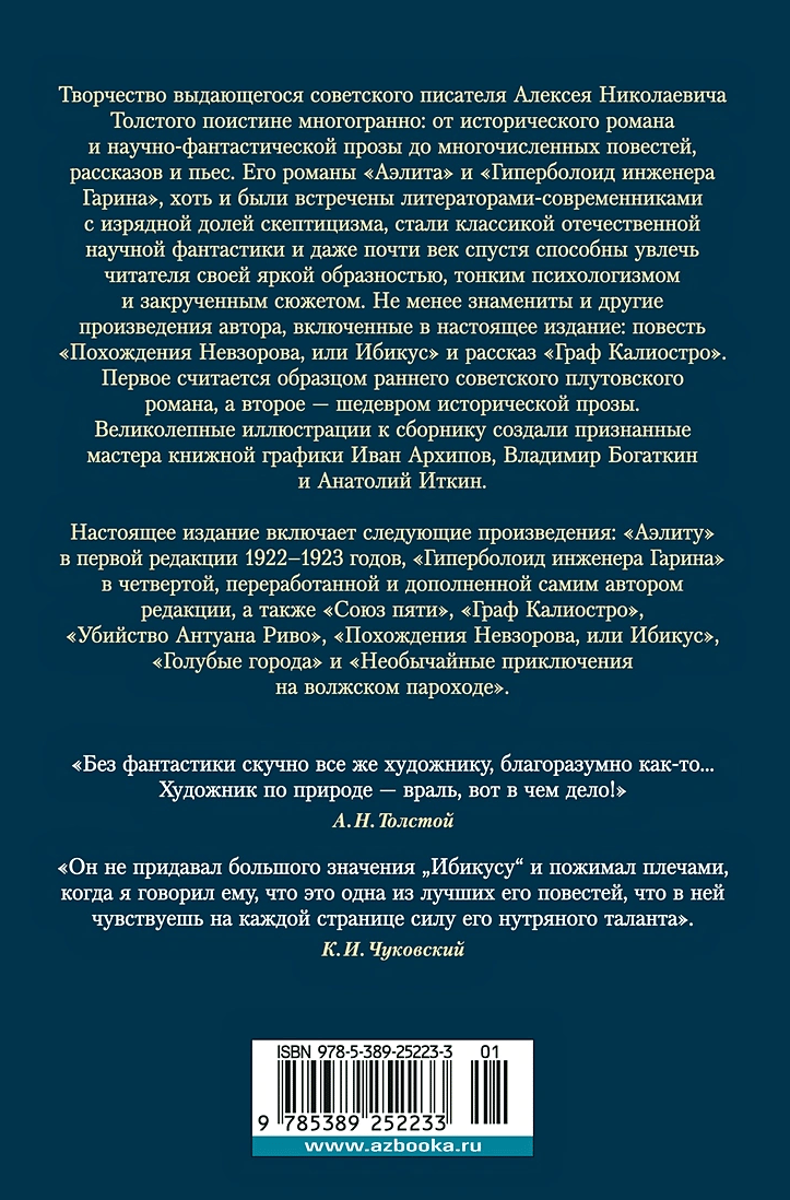 The work of the outstanding Soviet writer Alexei Nikolaevich Tolstoy is truly multifaceted: from the historical novel and science fiction prose to numerous novels, short stories and plays. His novels "Aelita" and "Hyperboloid of Engineer Garin", although they were met by literary contemporaries with a fair share of skepticism, have become classics of domestic science fiction and even almost a century later can captivate the reader with their vivid imagery, subtle psychology and twisted plot. No less famous and other works of the author, included in this edition: the story "The Pursuits of Nevzorov, or Ibicus" and the story "Count Cagliostro". The first is considered a model of early Soviet plutovsky novel, and the second - a masterpiece of historical prose. The collection also includes: "The Union of Five", "The Murder of Antoine Riveau", "Blue Cities" and "Extraordinary Adventures on a Volga Steamship". Magnificent illustrations for the collection were created by recognized masters of book graphics Ivan Arkhipov, Vladimir Bogatkin and Anatoly Itkin.