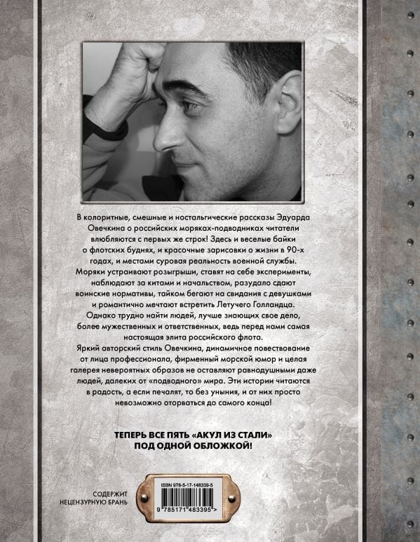 In the colorful, funny and nostalgic stories of Eduard Ovechkin about Russian submarine sailors readers fall in love with the very first lines! Here and funny tales about the navy everyday life, and colorful sketches of life in the 90's, and in some places the harsh reality of military service. Sailors make pranks, put on themselves experiments, watch the whales and the bosses, recklessly pass military standards, secretly run on dates with girls and romantically dream of meeting the Flying Dutchman. However, it is difficult to find people who know their job better, more courageous and responsible, because before us is the very real elite of the Russian Navy. Bright author Ovechkin style, dynamic narration on behalf of a professional, trademark maritime humor and a gallery of incredible images do not leave indifferent even people far from the "underwater" world. These stories are read in joy, and if sad, then without discouragement, and it is simply impossible to tear yourself away from them until the very end! Now all five "Sharks of Steel" under one cover!