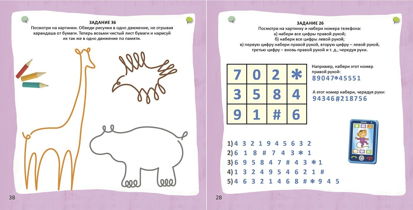 In today's "fast" world, where, due to the heavy workload of both adults and children, less and less time is left for self-development, express methods are needed that will not take little time, but will be effective. Due to everyday monotonous purposeful work of the brain associated with professional activities, adults experience difficulties in memorization, problem solving, concentration and switching of attention, analysis and synthesis of information. This is due to the fact that only certain cortical areas and functions develop. Children need to develop not only reading, math and writing skills, but also sensorimotor skills, speech, memory, attention and thinking in order to be successful in school. What's special: The manual is aimed at stimulating the work of the right and left hemispheres of the brain. The tasks combine motor and sensory functions: speech and the sense of rhythm, speech and perception of three-dimensional space, the sense of rhythm and operations with sequences, actions with numbers and color perception, movement and reading and others. Thanks to its convenient format, the album can be taken on the road. Lessons with the book contribute to the development of reading and writing skills, math, sensorimotor skills, memory, logical thinking, attention, speech, imagination and fine motor skills. Important for parents: This manual is relevant both for children from 5 years old and for adults who have noticed the following symptoms: forgetfulness, inability to express their thoughts, excessive fatigue, absent-mindedness. It is recommended for individual and group lessons, as well as for family, company and traveling games. How to work with the manual: Do the exercises every day. Do not do a lot of exercises, 3-5 pages a day is enough. Do the exercises at the same time. Preferably in the morning hours, as the brain has not yet had time to get tired. Increase the complexity of the tasks as you master the material. Gradually increase the pace. At the beginning of classes you will feel the result, at some point perhaps the development will continue, but less tangible. The most important thing is not to quit and keep working! Motivate yourself and your child.