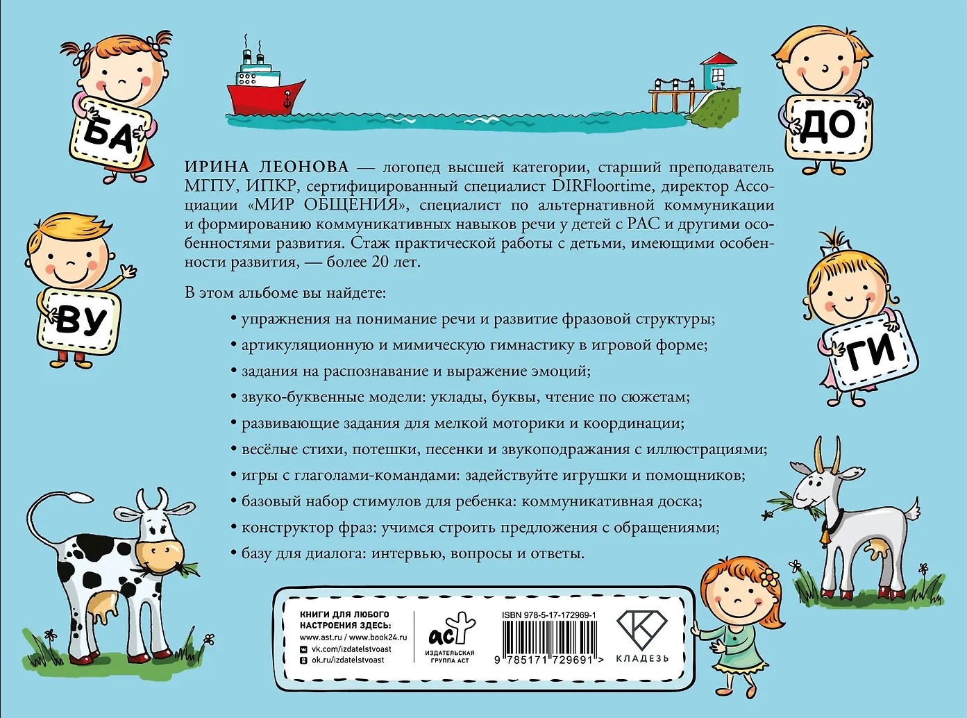 This album will help children develop speech and communication skills through simple and effective game-based activities. The methodology includes developing articulatory motor skills, imitation, and self-regulation, which are important for developing phrasal speech and comprehension. The exercises are structured according to difficulty level and are accompanied by prompts for adults. Suitable for children with varying levels of speech development, including those with ASD. It is recommended for speech therapists, special education teachers, and parents to allow lessons to be conducted at any convenient pace.