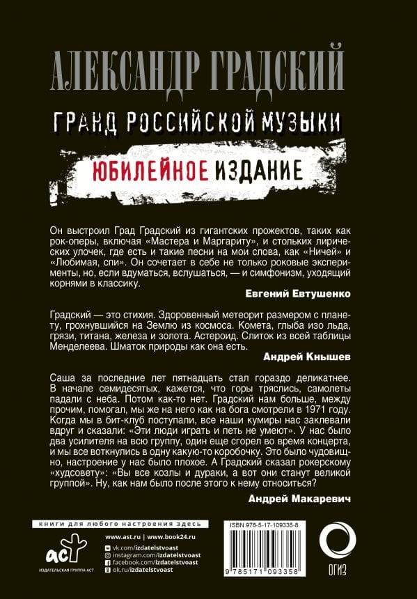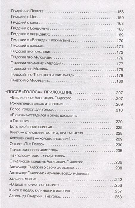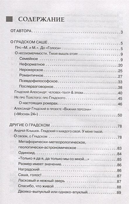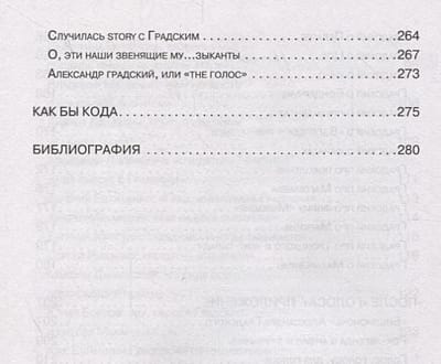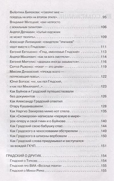 The book's release is timed to coincide with Alexander Gradsky's anniversary. The magnitude of the "parent of Russian rock'n'roll" is hard to overestimate, no matter what we are talking about: mentor, composer, personality. Confirmation of this can be found in the conversations and interviews collected in this edition. Andrey Makarevich, Yevgeny Yevtushenko, Alexander Buynov, Yevgeny Margulis and other, not less known to us characters, will tell about cases, crossings, curiosities, about him. And Gradsky, in turn, about others, with his inherent sparkle.