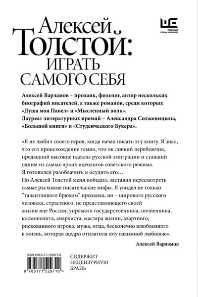 Alexei Varlamov is a novelist, philologist, and author of several biographies of writers, as well as novels, including My Soul Pavel and The Myspiritual Wolf. Winner of literary awards - Alexander Solzhenitsyn, "Big Book" and "Student Booker". Alexei Tolstoy, a novelist known to everyone since childhood, will be quite different from what readers imagine him to be. An emigrant and a patriot, a statesman and an anarchist, an egoist and an exemplary family man - a figure of contradictory and therefore infinitely interesting ...