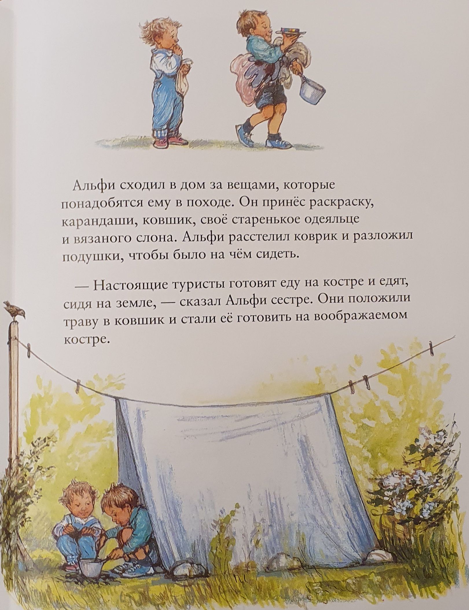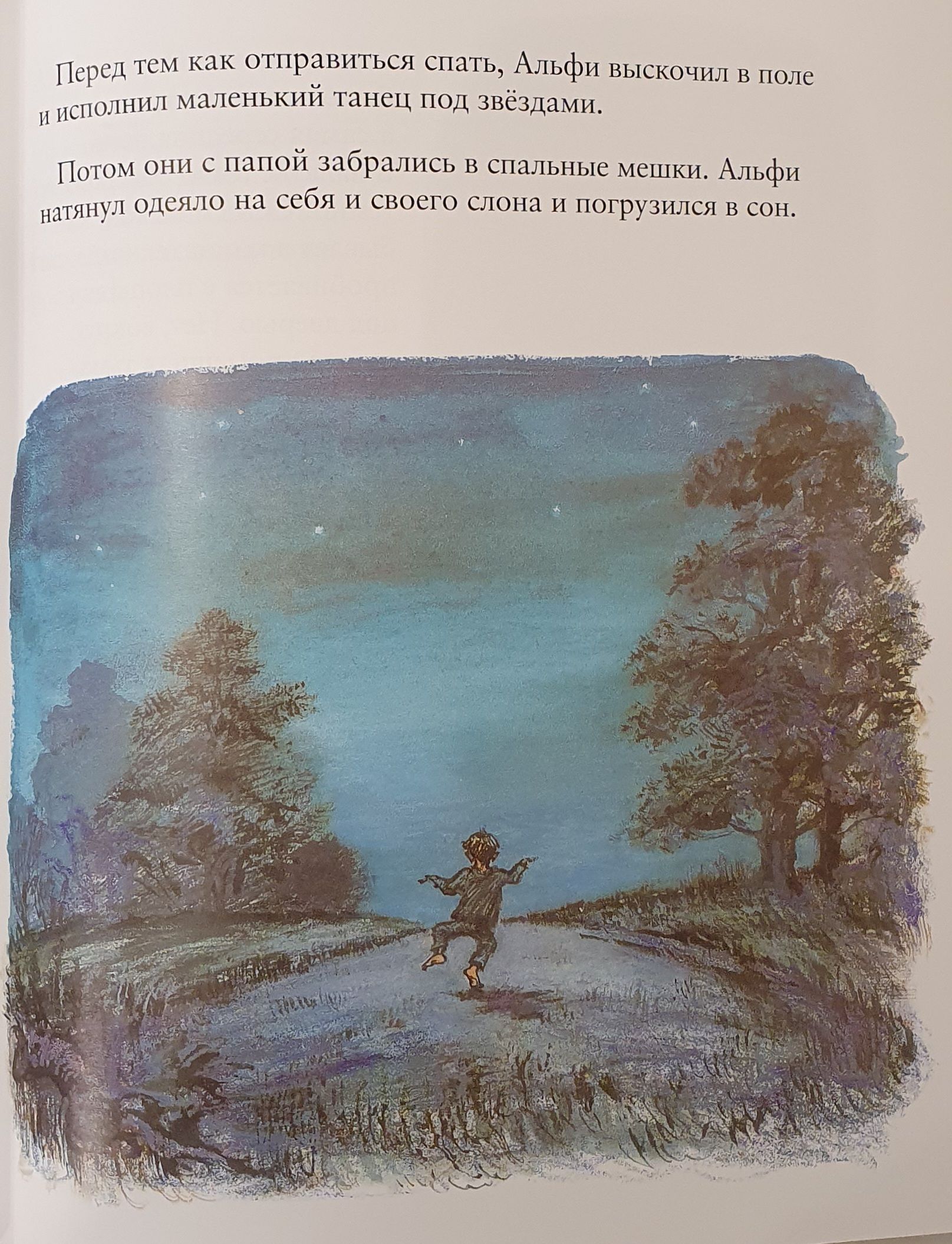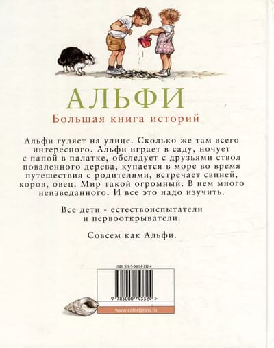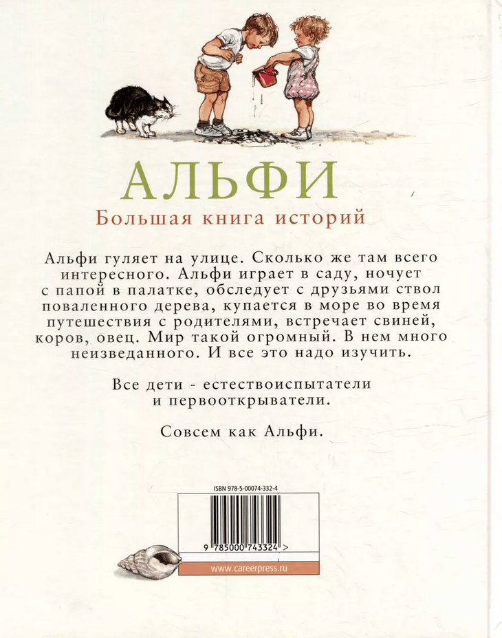 Alfie is waiting for amazing discoveries. Together with his little sister Alfie visits his grandmother. He sleeps in a tent with daddy, walks among grazing cows and sheep, plays in the garden, goes to the sea. Alfie is interested in bugs on the path, a fallen tree trunk, the moon over the house, an unusual pebble. Everything demands his attention.