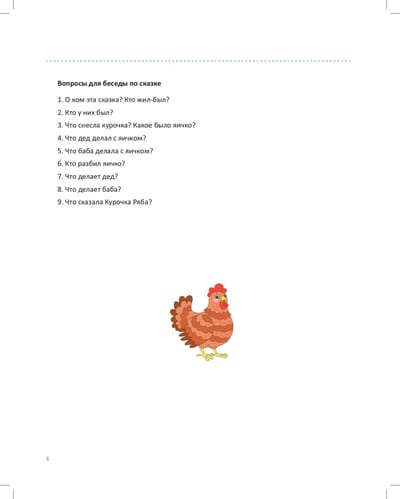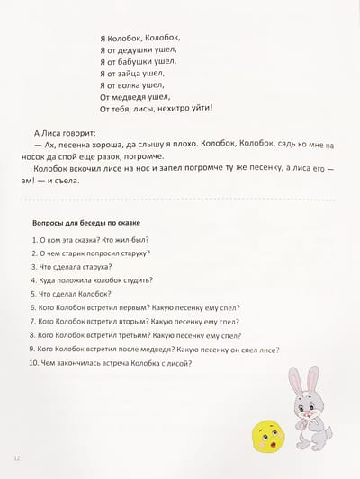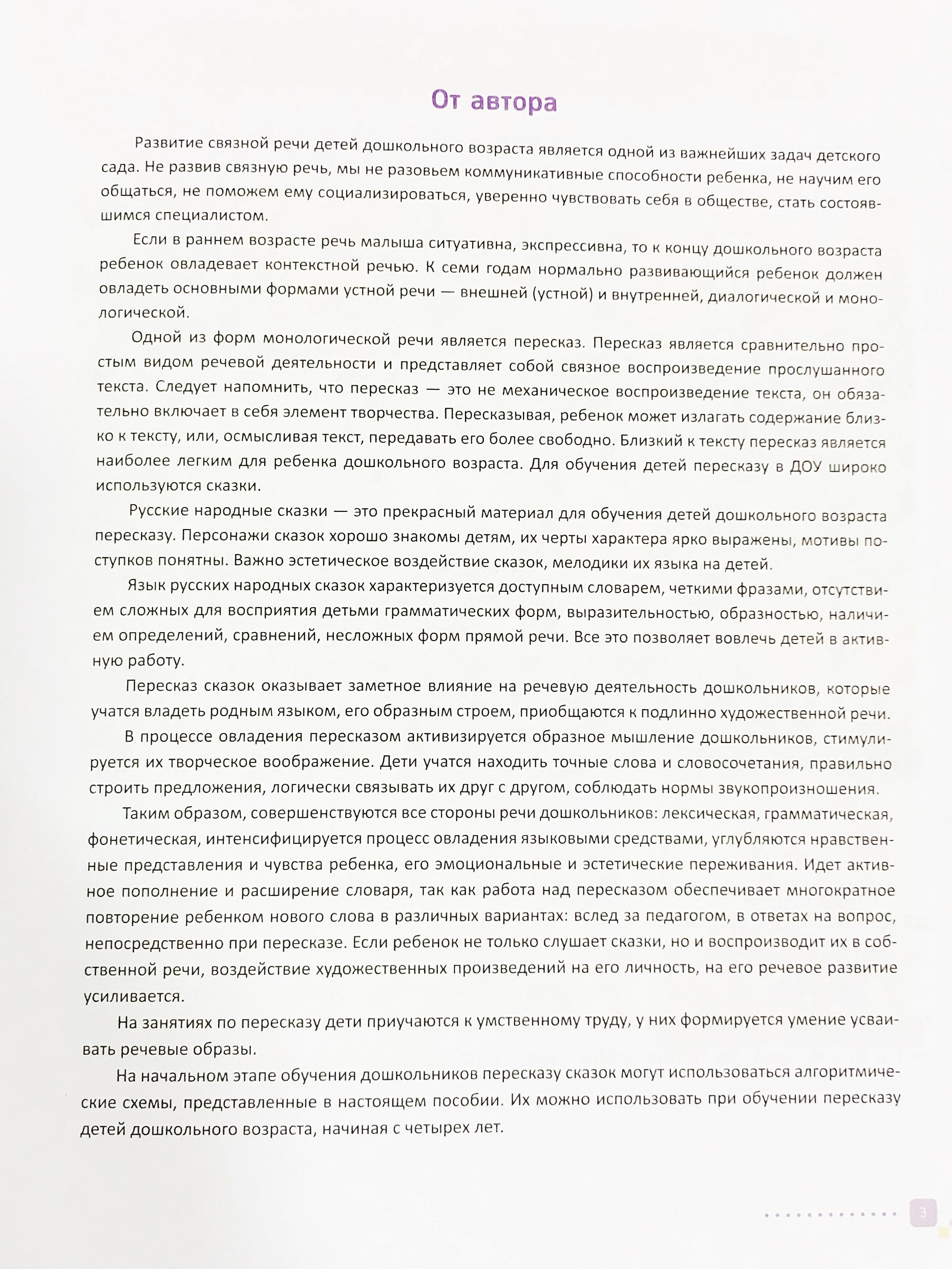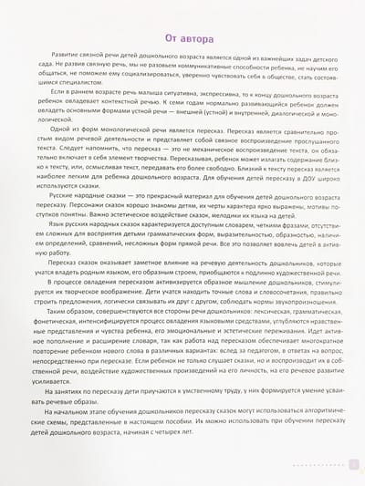 The development of a child's coherent speech is one of the most important tasks of preschool childhood. Russian folk tales have always been used to develop children's speech and to teach them retelling, teaching children to feel the depth and beauty of the Russian language, allowing them to hear the melody of Russian speech. The manual presents Russian folk tales, questions for conversation on them, algorithmic schemes for retelling fairy tales, color illustrations.