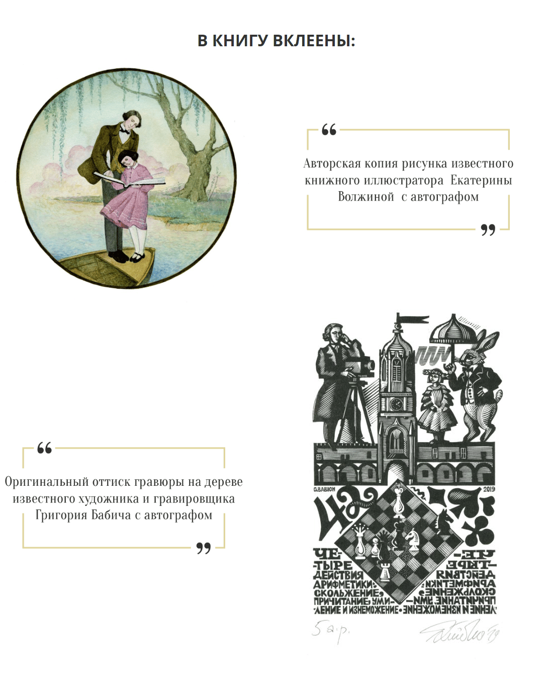 On one side of the book, an original copy of the drawing by the renowned artist E. Volzhina, autographed by the author, is pasted into the book. On the other side, an original engraving by the artist and engraver G. Babich, autographed, is pasted into the book.