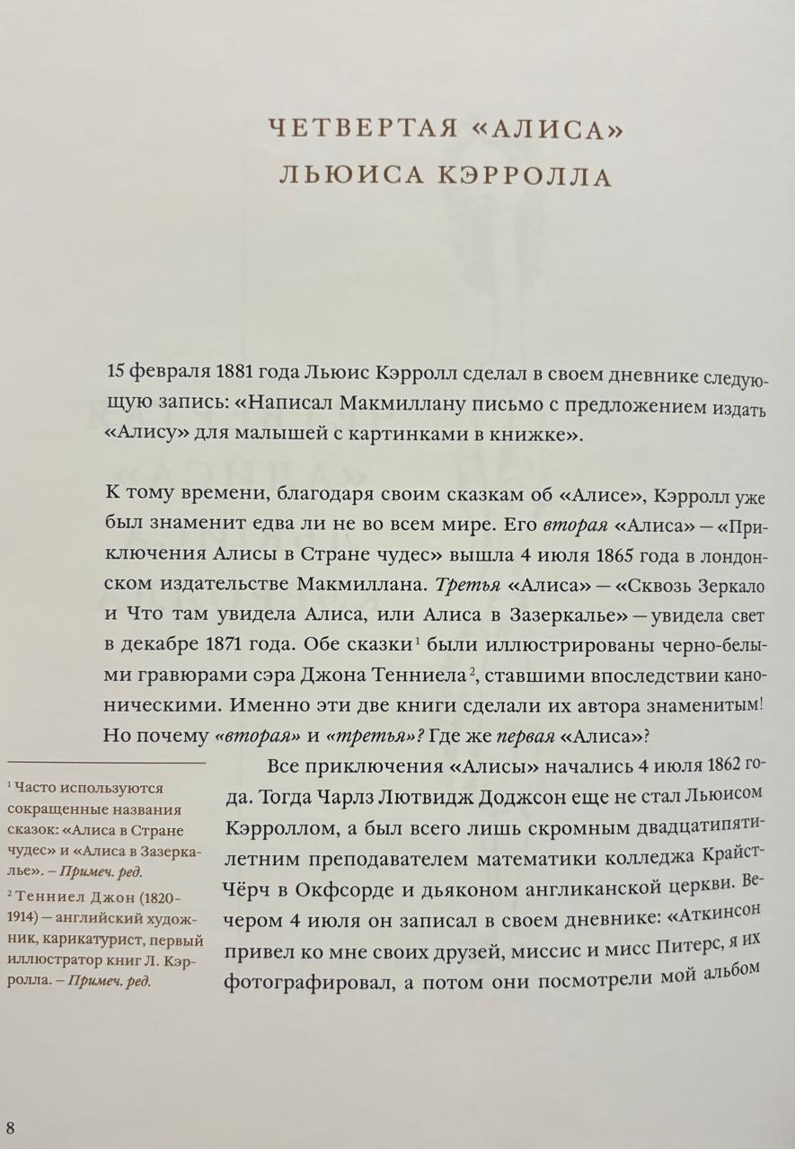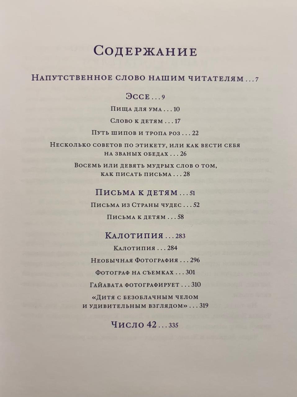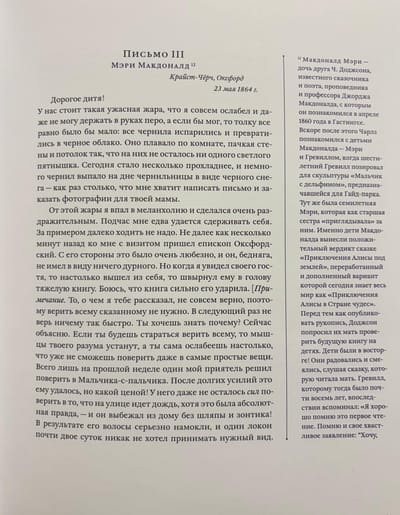 This book, for the first time in Russian, includes detailed commentary on the texts, the most complete collection of Charles Dodgson's letters to children, the largest collection of the writer's facsimiles, a complete album of photographs of the real Alice, and "C. Dodgson and the Number 42 – Mysticism and Reality."