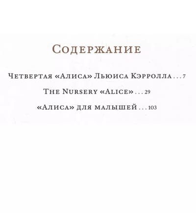 Book contents: On the one side: The Nursery "Alice" — in English, a complete reproduction of the 1890 edition, color illustrations, layout by L. Carroll unchanged; "Alice" for Little Ones — in Russian, with color illustrations, layout identical to the English version.