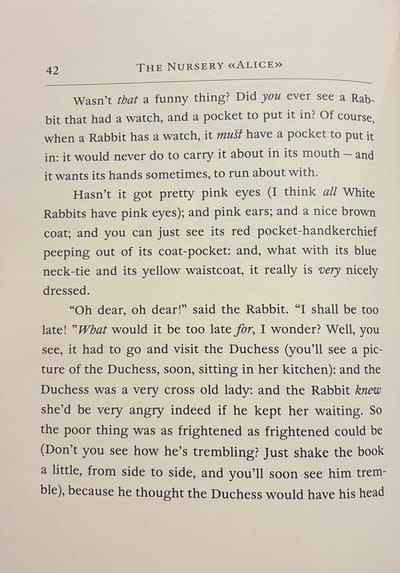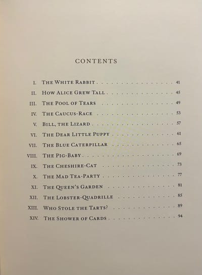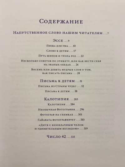 The book's other components include an introduction, essays ("Food for Thought," "A Word to Children: The Path of Thorns and the Path of Roses," "A Few Tips on Etiquette, or How to Behave at Dinner Parties," "8 or 9 Wise Words on Letter Writing"), letters to children ("Letters from Wonderland," "Letters to Children"), calotypes ("Calotype," "Unusual Photography," "A Photographer on the Set: Hiawatha Takes Photographs," "A Child with a Cloudless Forehead and a Wonderful Eye"), and "The Number 42."